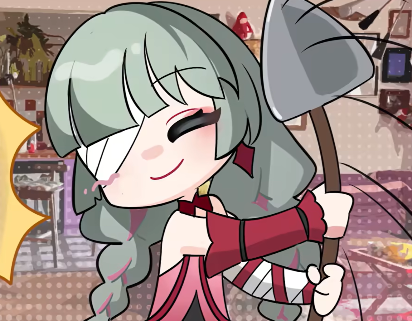 Та розовая дуреха с вилкой в глазу с меткой в подмыхе для вылизывания. Может будет фиолкой играбельной, как булка потом. Отрисована миленько слишком. До сих пор неприятно, что нельзя выбрать у бубазаврихи кантарелы, чтобы предложила аптечную милаху вместо себя. Пили бы фунфыри, пановали.