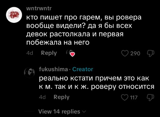>>6116181 Линей стелилась под ровера потому что пизданула его байком, вот и исправляла косяк, да и как "старшая" помогала новичку освоиться (плюс повод проебать пары), еще вроде подозревала его в чём то, вот и держала поблизости. А потом ровер в ответочку начал вытаскивать её из пиздеца в который она сама себя затянула, как физически так и словесно, ну и там уже течка пошла. Морни знает нас.