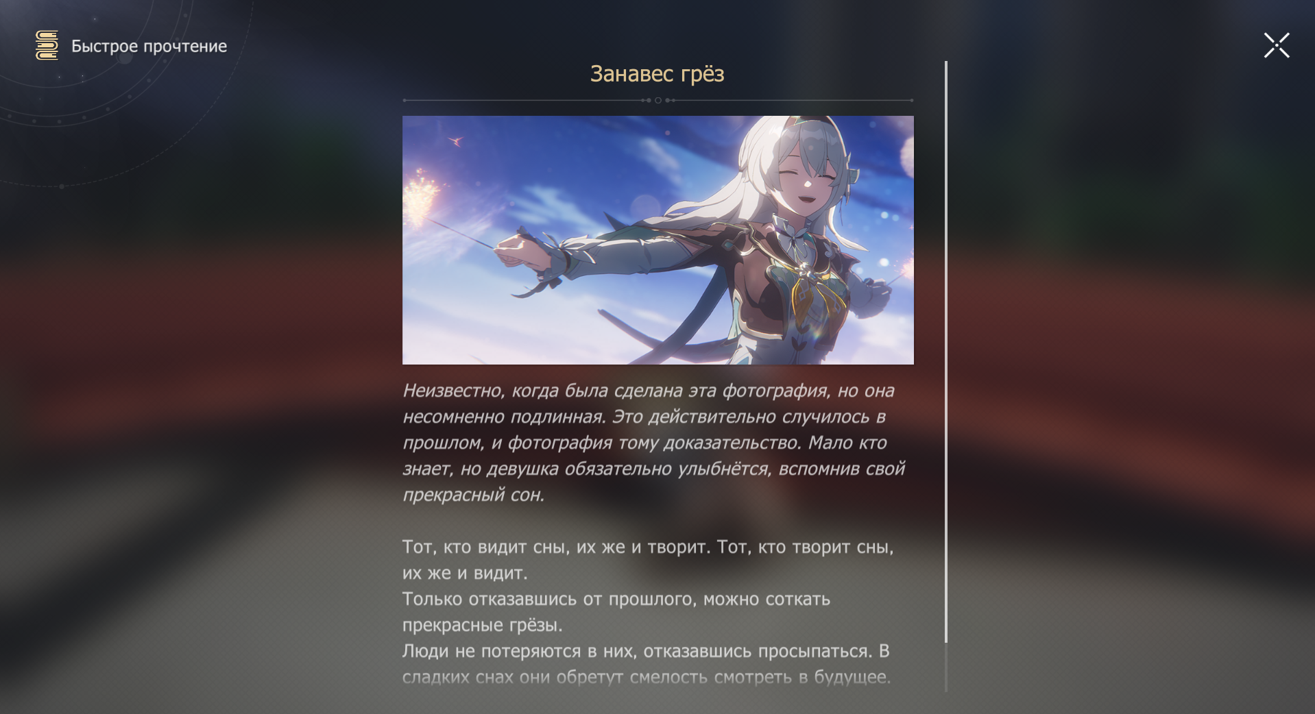«Я Яо Гуан, Прозорливый Стратег Юйцюэ Сяньчжоу. Можешь называть меня госпожой Яо, как и все остальные. Хотя я могла бы предвидеть все подробности этой встречи, но разве это весело? И действительно, здесь меня поджидало немало приятных неожиданностей». Загадочные, смелые, радикальные и революционные действия поражают воображение. Глазом Охоты узрев грядущие беды и удачи, Прозорливый Стратег в одиночку бросилась навстречу опасности, зная, что судьбу не одолеть. Как можно изменить судьбу с таким плохим предсказанием? ========== Аха! Особое поздравление Яо Гуан: ✧ 1-е место за «лучшего предсказателя Сяньчжоу» ✧ ✧ 1-е место за «дикого генерала» ✧