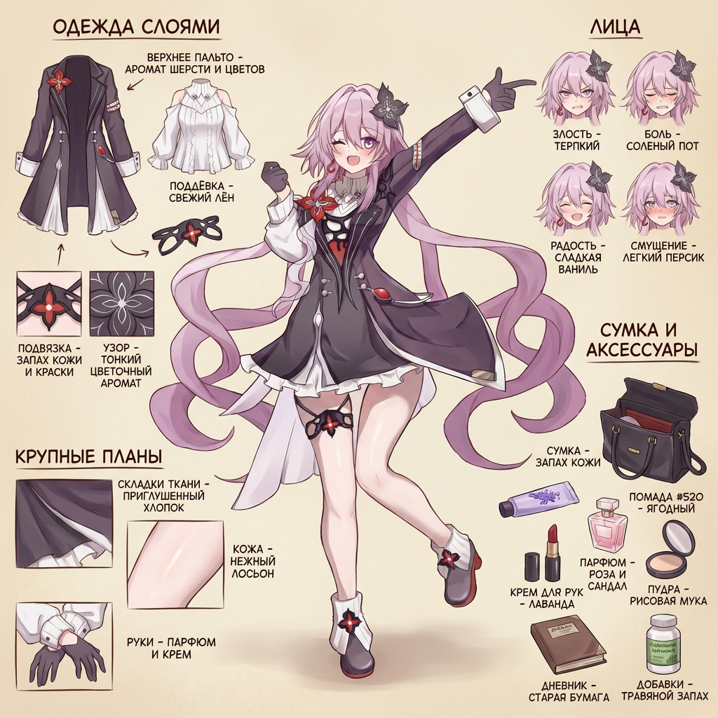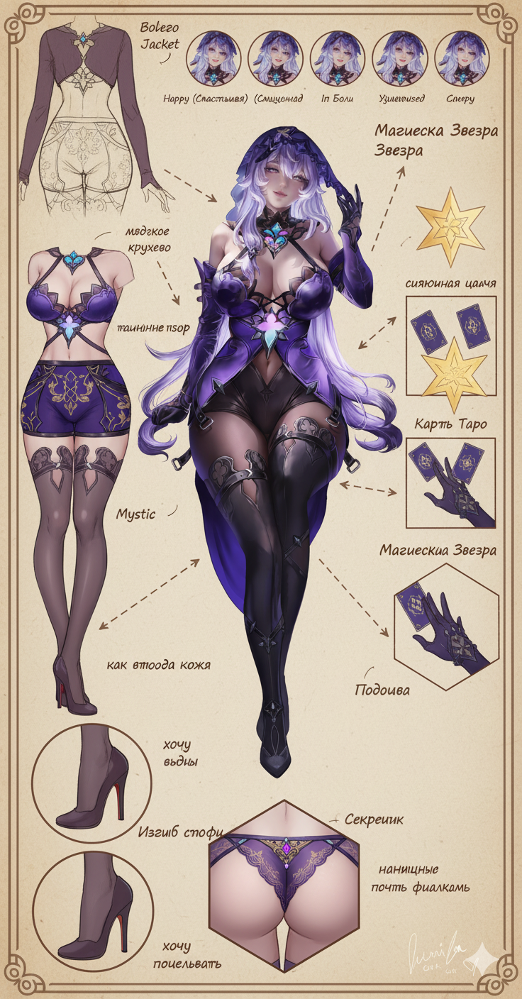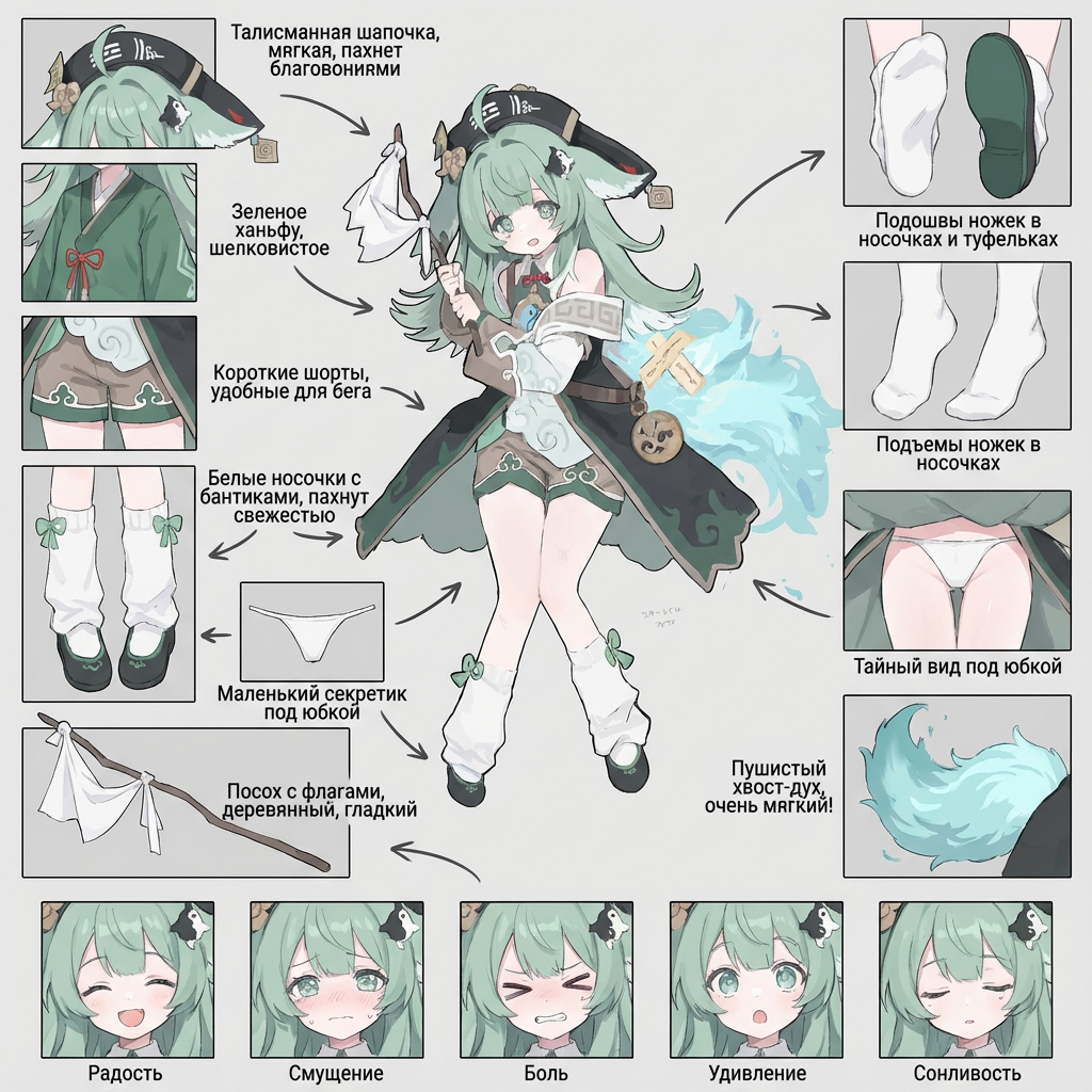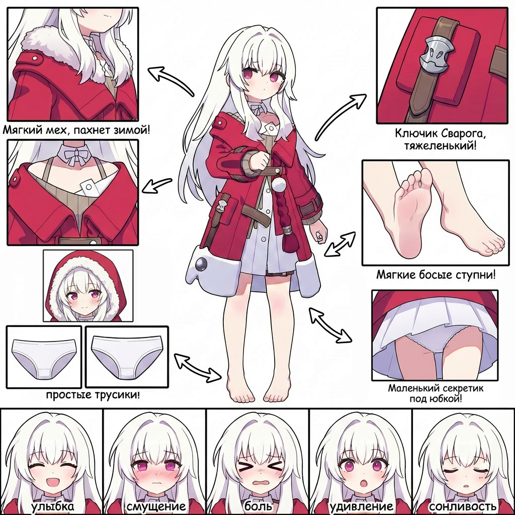 First, place the main character from the original image in the center (if there is nudity in the original, add minimal covering), then expand and deconstruct her various details (presented as zoomed-in close-ups surrounding the subject, linked with arrows to show correspondence), and add your cute and playful commentary on russian (detailed features, small guide, design concepts interspersed with tactile and olfactory descriptions): 1: Individual close-ups of various clothing items (multiple images, removing layers as worn, only clothes on panels - not on character). 2: Seductive display of the soles and insteps (two images); if wearing stockings, retain them on the feet, if not - barefoot. 3: Close-up low-angle view of the thong from under the skirt. 4: Key props (1 to 3 images) (accessories, weapons... etc.). 5: Comparison of continuous expressions (five images): happy; blushed; in pain; surprised; sleepy. Other requirements: Do not simply copy the original image. Use full color for details whenever possible; line art may be used if obvious nudity occurs.