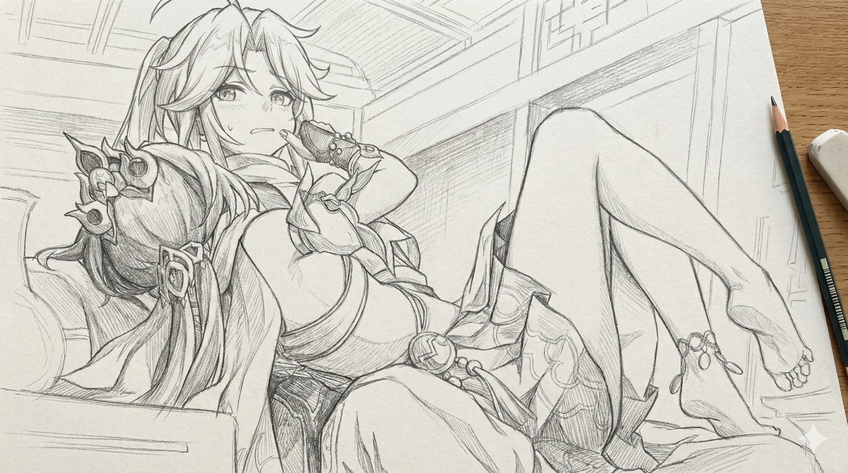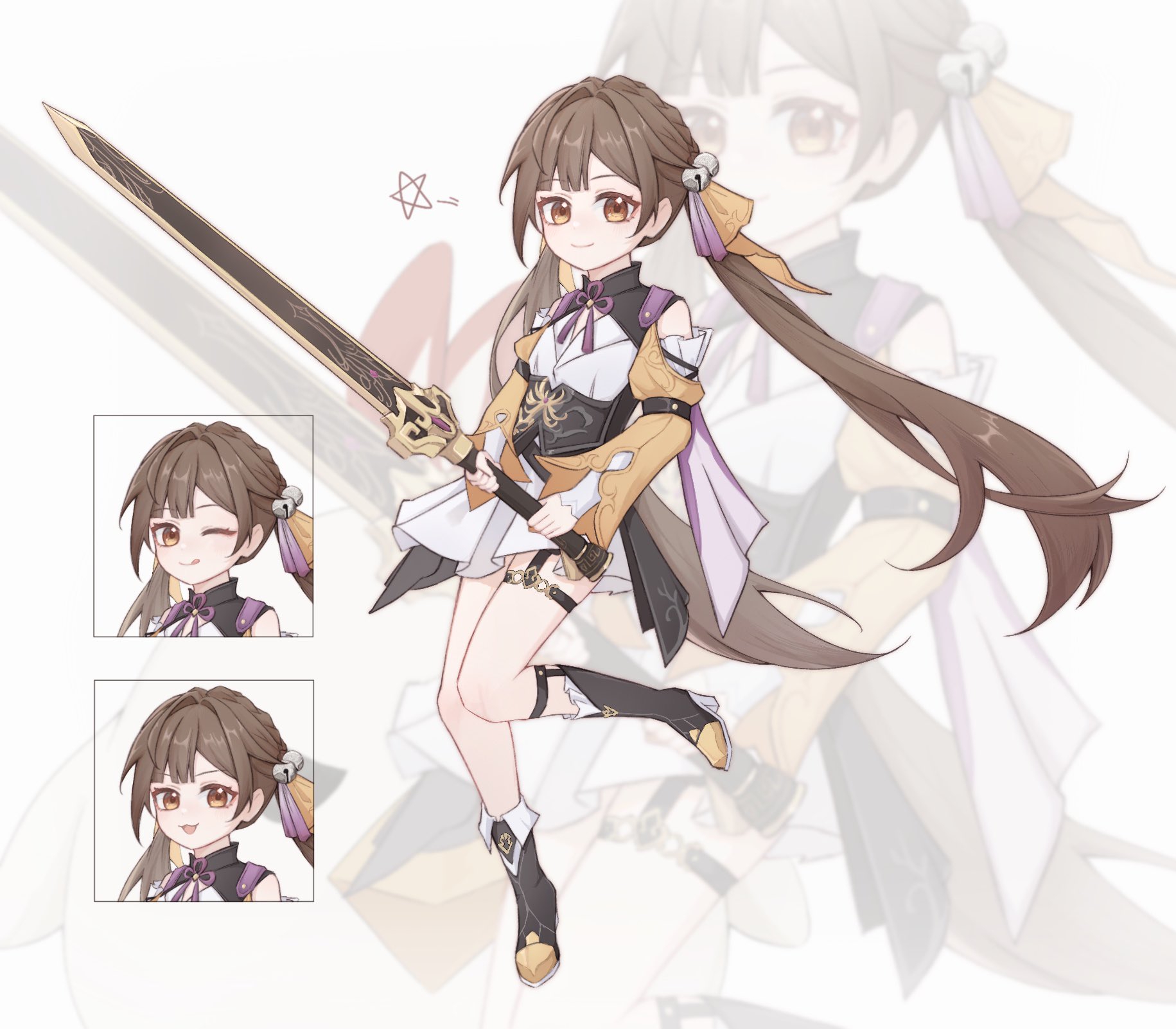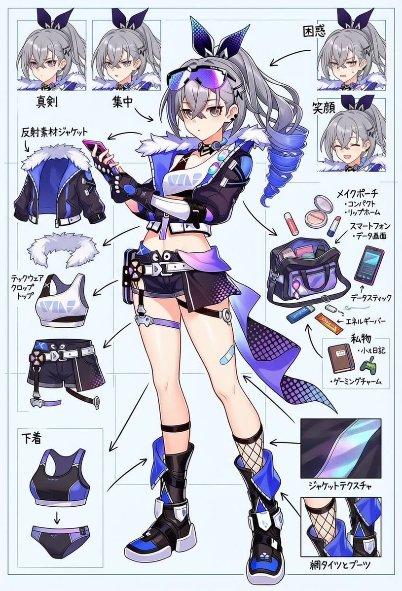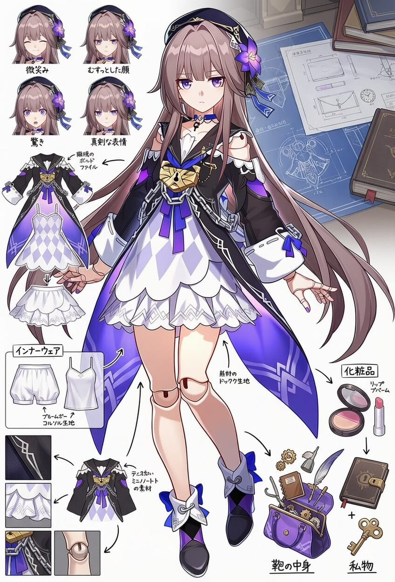 First, place the main character from the original image in the center (if there is nudity in the original, add minimal covering), then expand and deconstruct her various details (presented as zoomed-in close-ups surrounding the subject, linked with arrows to show correspondence), and add your cute and playful commentary on russian (detailed features, small guide, design concepts interspersed with tactile and olfactory descriptions): 1: Individual close-ups of various clothing items (multiple images, removing layers as worn, only clothes on panels - not on character). 2: Seductive display of the soles and insteps (two images); if wearing stockings, retain them on the feet, if not - barefoot. 3: Close-up low-angle view of the thong from under the skirt. 4: Key props (1 to 3 images) (accessories, weapons... etc.). 5: Comparison of continuous expressions (five images): happy; blushed; in pain; surprised; sleepy. Other requirements: Do not simply copy the original image. Use full color for details whenever possible; line art may be used if obvious nudity occurs.