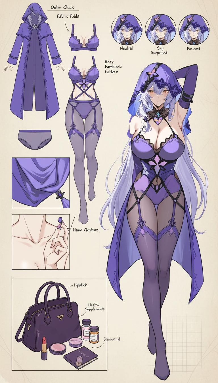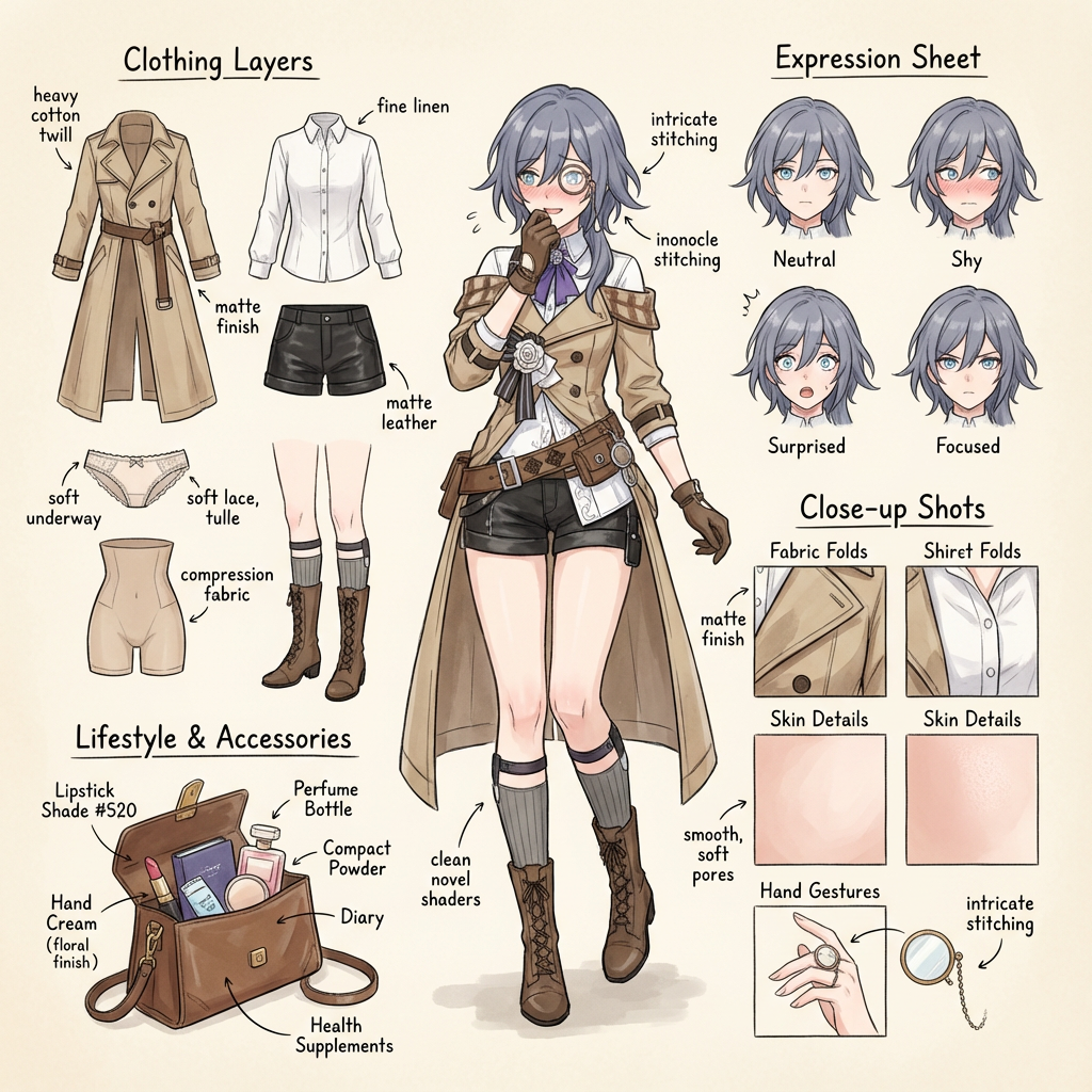 Hand-drawn style fashion concept breakdown diagram. Center: A full-body shot of a stylish, confident, slightly sexy (but not explicit) female character, with a natural and energetic pose. Surrounding: Structured layout of her key elements: • Clothing layers—showing coat, underwear, leggings (lace, tulle material), shapewear, and zooming in on detail patterns. • Expression sheet—3-4 facial expressions (neutral, shy, surprised, focused). • Close-up shots—fabric fold textures, skin details, hand gestures. • Lifestyle and accessories—opened handbag containing daily items: lipstick, perfume, compact powder, hand cream, diary, health supplements. • Material annotations—handwritten style notes next to each item (e.g., "soft lace", "matte leather", "shade #520"). Background: Soft beige or parchment texture, creating a design sketch atmosphere. Lighting: Clean and soft shadows, making the image integrated. Output: 4K HD 2D illustration, combining sexiness and fashion sense. Language: English labels.
