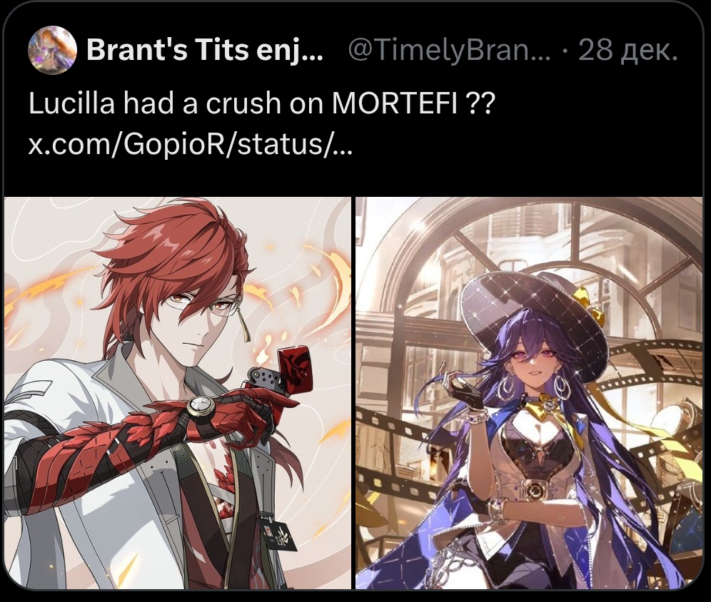 >>6122804 А по теме Люциллы хз, тебе че интереснее? По киту особых подробностей, кроме роад мап от двух сливеров не было. Теоретически, один анон предсказывал, что она займет слот электро-мДД от дотов (выглядит реалистично, если смотреть на мапу + держать в голове, что Чиса должна ставать еще куда-то БИСом). По лору, ну, директриса. Работала раньше в НовФеде, была коллегой Мортыча, пыталась убедить его остаться и дальше работать на родине, но тот свалил в Китай. А она в итоге в Рай Лохов дала газу. Не держатся блистательные умы в нашей псевдо калмерике Новогодней радости...
