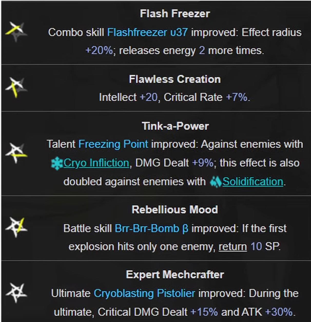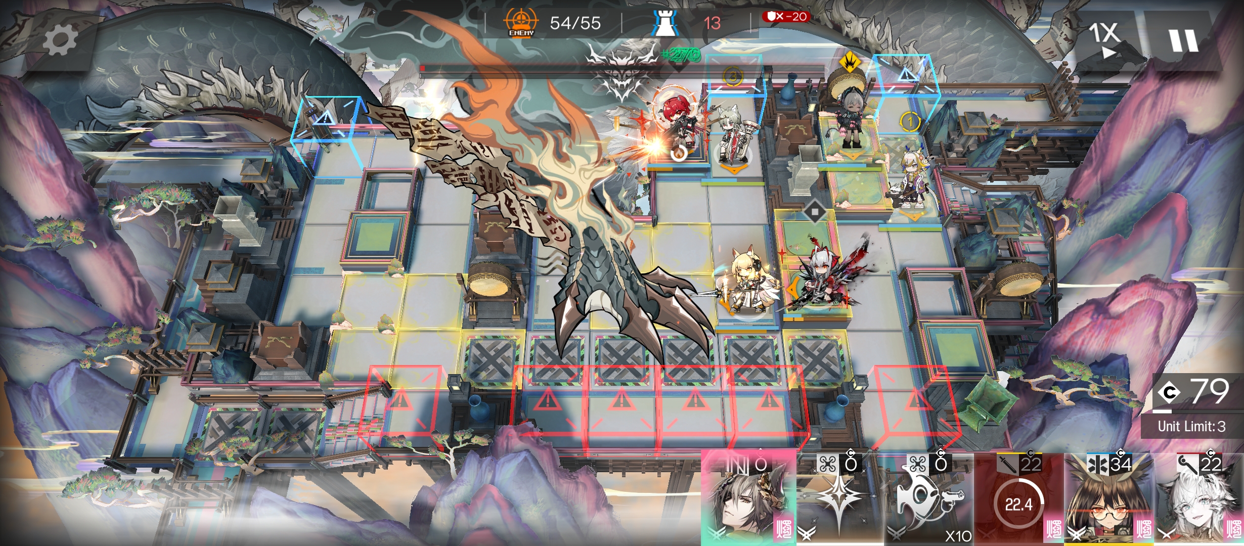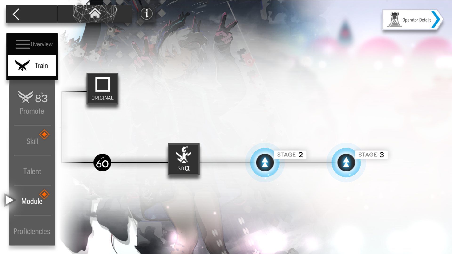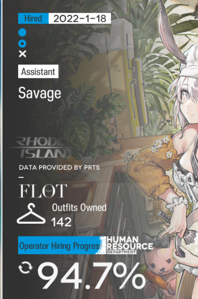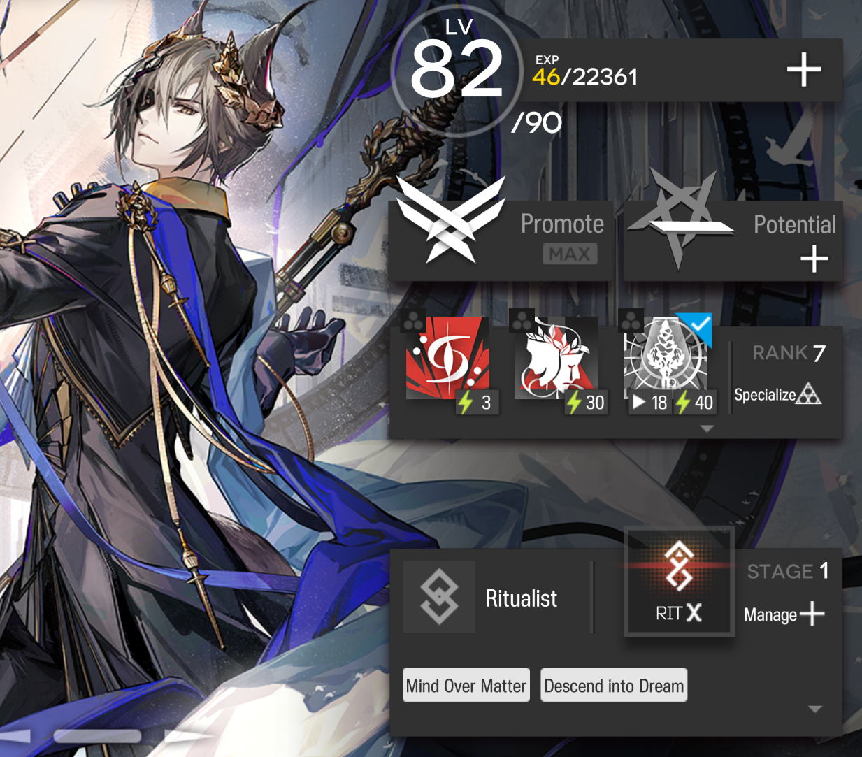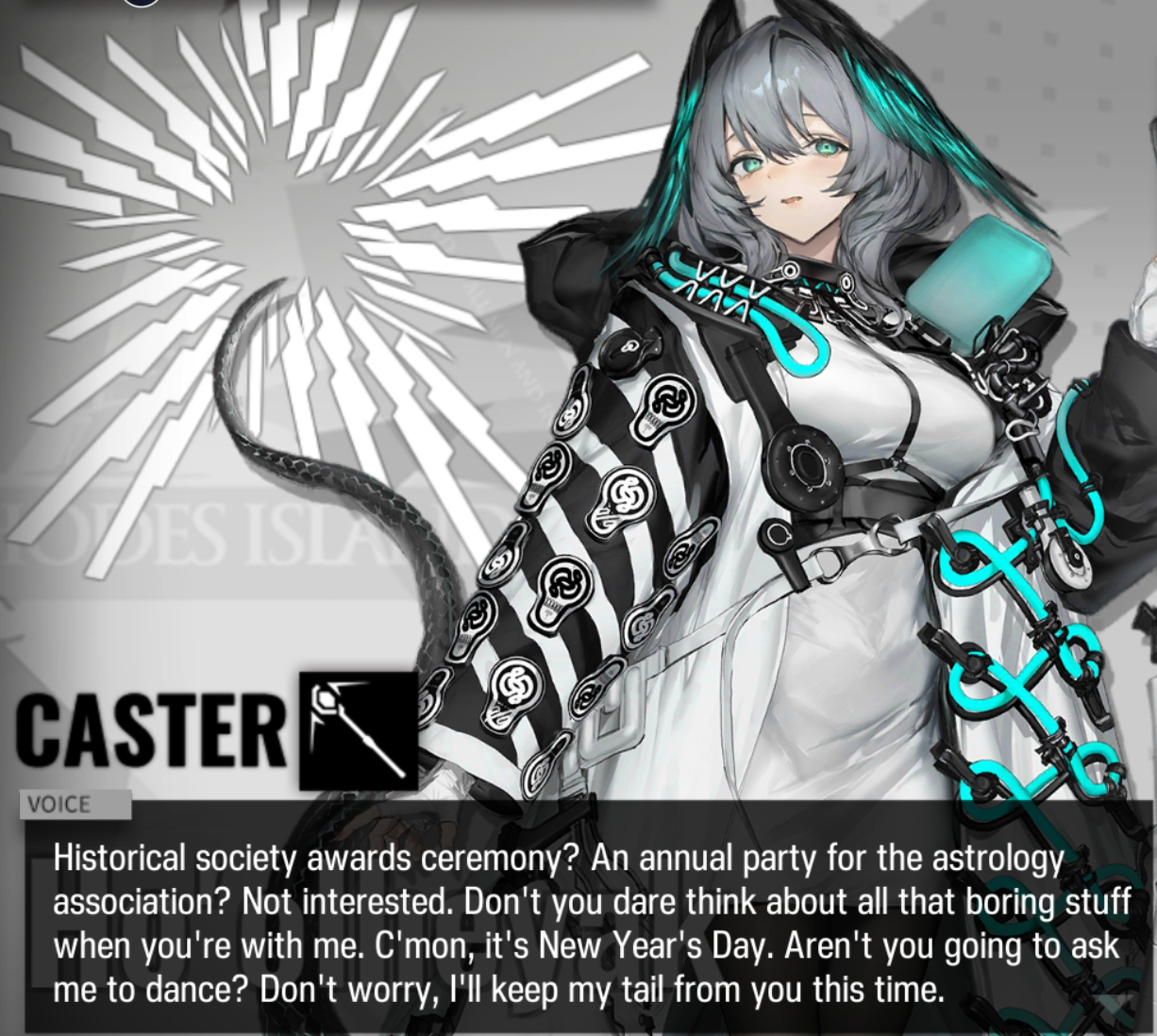 Skill 2: Stops attacking, ATK increases, puts this unit and the Operator in Attack Range with the lowest HP% to Sleep until the skill ends, whilst also continuously putting enemies surrounding this unit and the Operator to Sleep, Talent 1's effect increases to a few times, skill can be manually deactivated (Skill can be halted at any time while active)