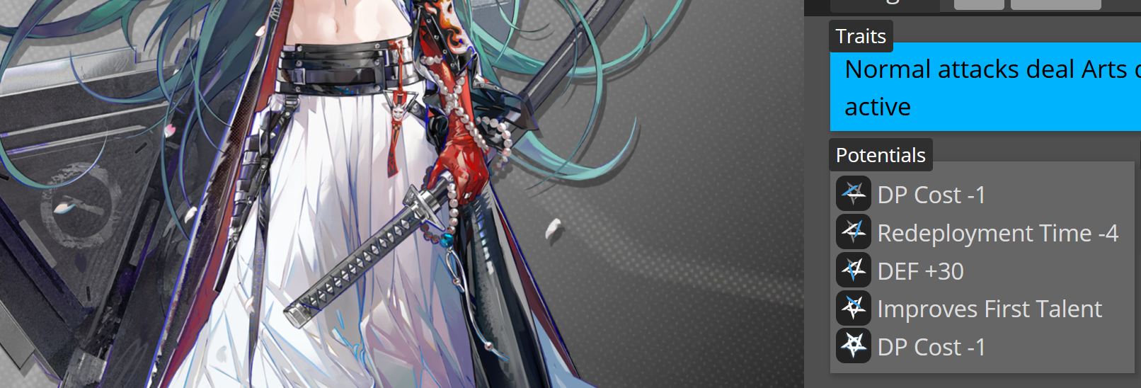 Trait: Deals Arts damage; When skill is active, attacks instead restore the HP of allies (heal amount is equal to 75% of ATK)