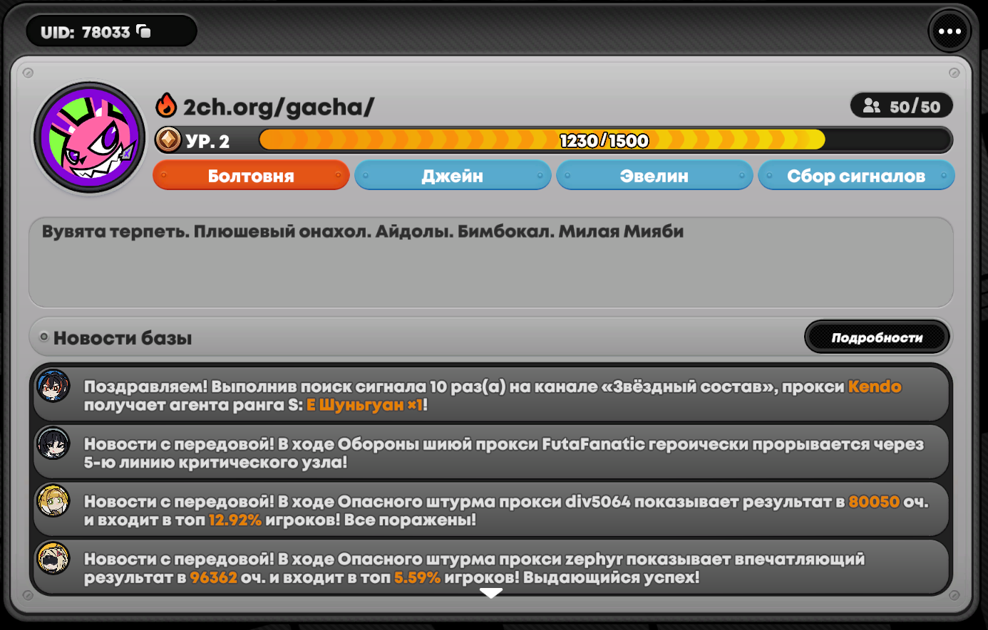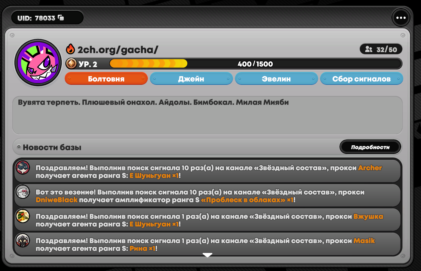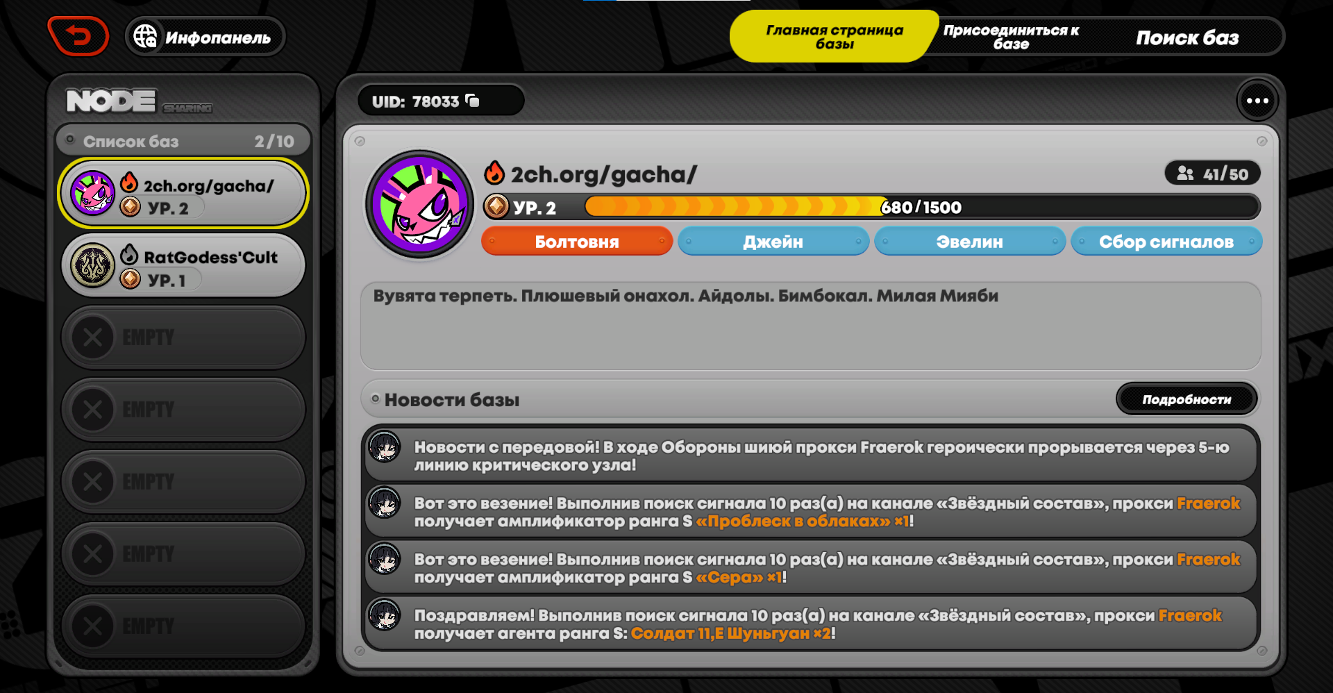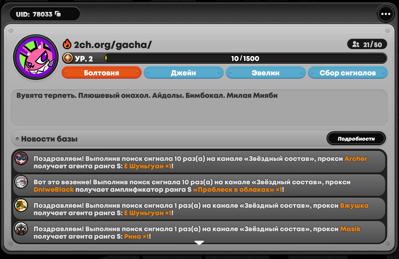 Что там по базам, какой положняк? Есть Мышинг, есть общая /gacha/, есть свидетели праздника. Нахрен это вообще надо, можно ли спокойно сидеть, не отсвечивать, периодически вкидывай вопросы, ибо нуб и играю месяца два?