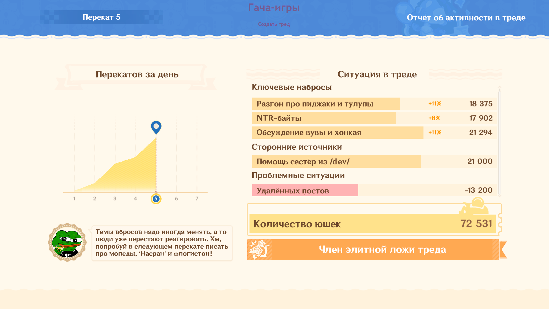 В Хоровод не закатывался из-за негативного форса, кстати, мол игра для дураков, а так бы мог раньше закатиться. Сейчас думаю, сколько интересного контента я в целом пропустил из-за того, что слишком верил бордам.