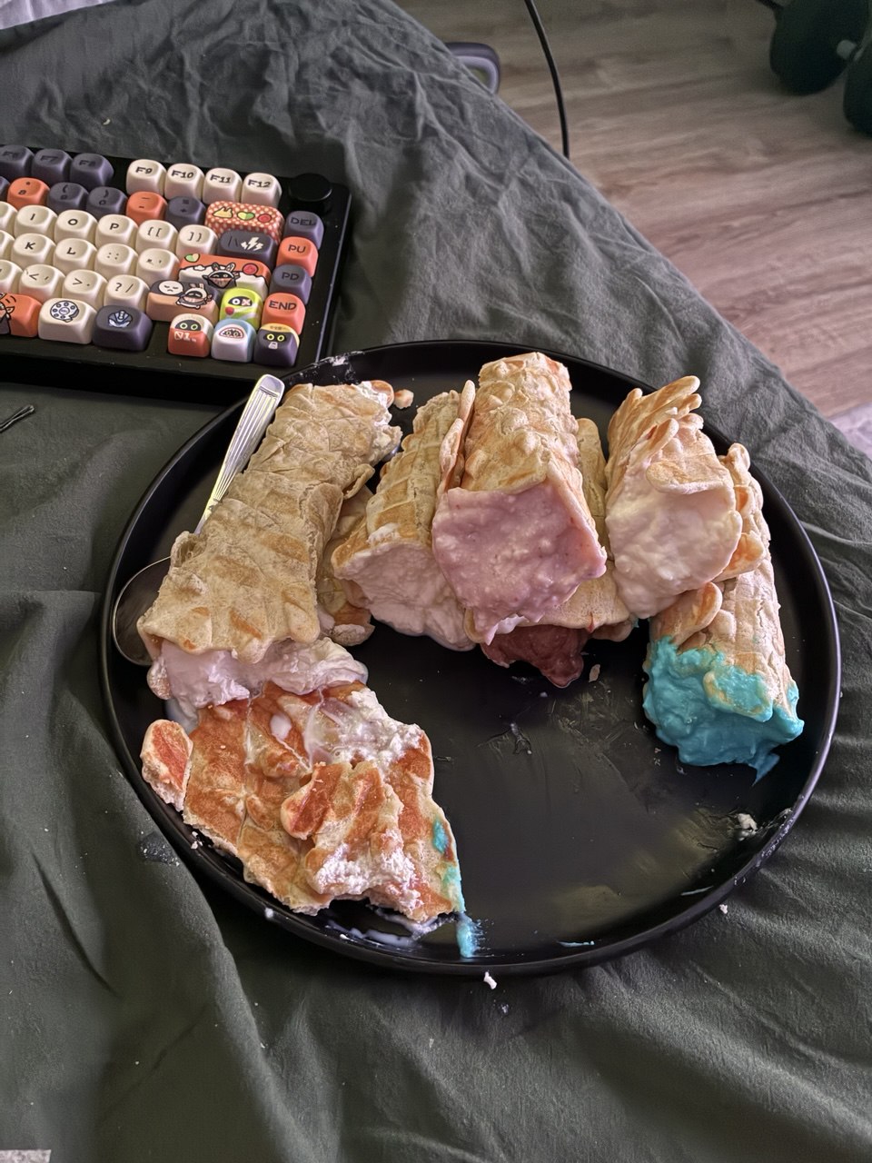 >>6133809 Ну просто представь, что должны были быть хрустящие тонкие вафли, но из-за разрыхлителя подымались и надувались как венские. Я их из-за этого сильнее плющил и они неохотнее скручивались в целом. А цвета это просто сиропы, блю кюрасао там, малиновый, они разные все.
