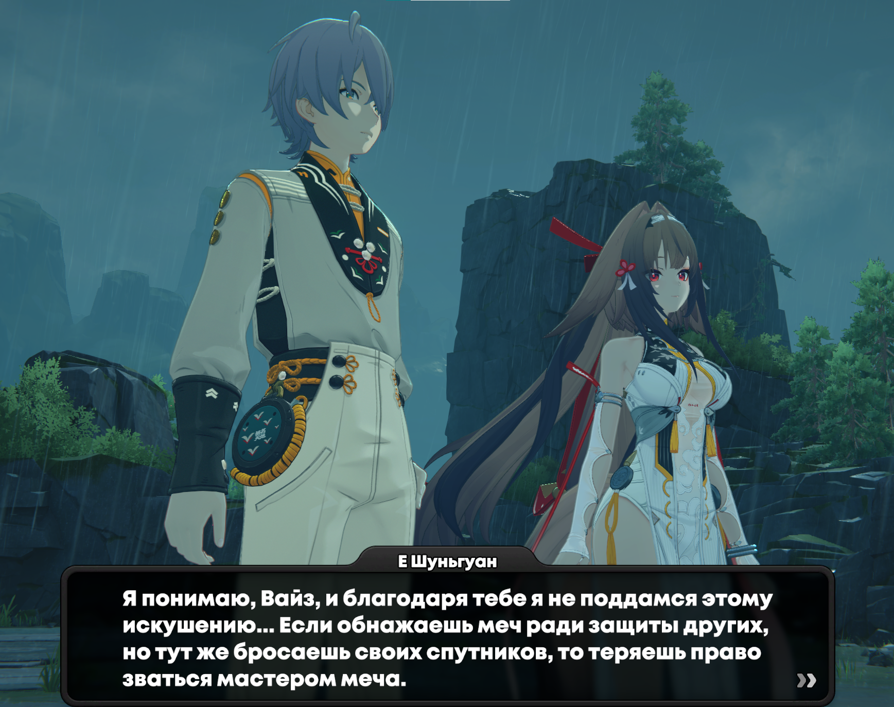 Каждый раз смешно когда они пытаются давить эту хуйню что якобы Вайз и эта шмара близки друг другу это выглядит так потешно, особенно когда он стоит вот так блять как манекен нахуй с взглядом тупа в никуда. Как же тупо нахуй. Можно было потратить минут 20 буквально чтобы познакомить ГГ с девкой и дать им чутка времени, а в итоге хуйня вот такая получается. Бегаю, с ней по её миру в который могут попасть лишь только мечники этого Небесного меча и блять так тупо это всё выглядит. Еще этот троп что все мечники имеют внешку знакомых это кал. "Шифу" в конце полюбому окажется сестрой Письюань. И я вообще молчу про то как тупо нахуй все эти волшебные пространства меча звучат. Заебало.