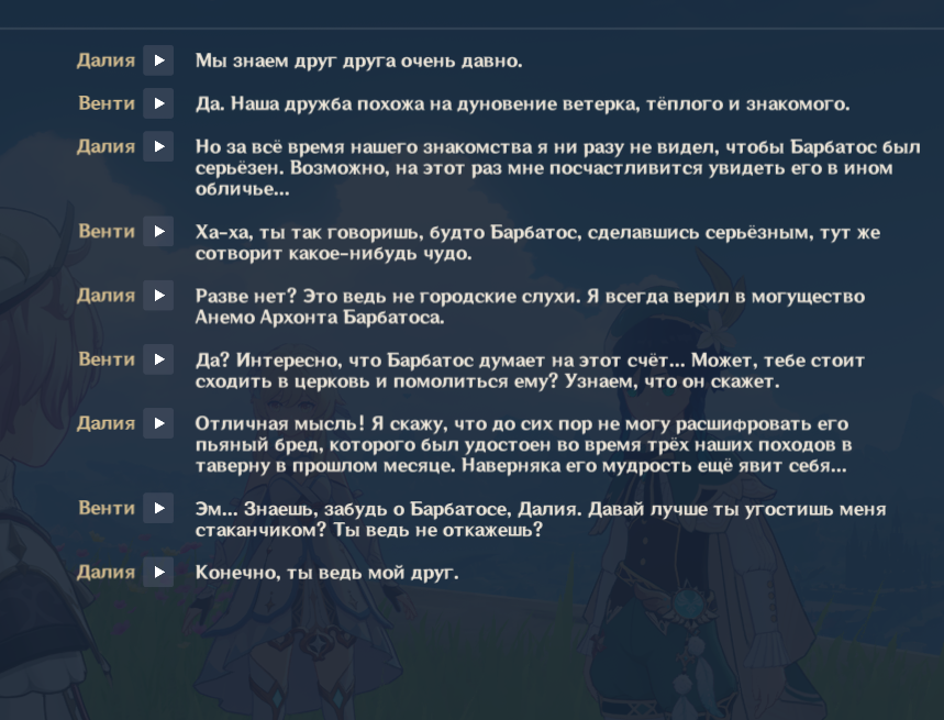 То есть до этого Венти где-то спал, в жизни Монда вообще не участвовал, верно же? А Далие - просто человек, когда он успел подружиться с Вентилем, м?
