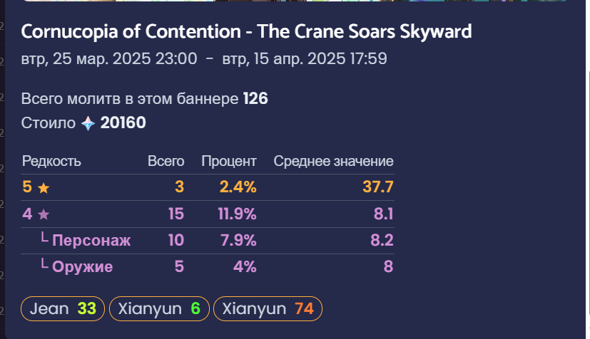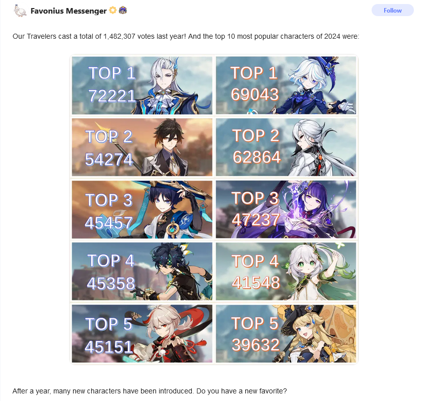 Из лично статистики по персонажам: 1) 🗿Коломбина ещё не успел выйти, а уже расположилась на 6 месте. 2) ⚰️Ху Тао с огромным трудом пробилась в топ10. Изначально она была намного ниже, однако после публикации в разных ТГ каналах ее позиция менялась, за счет привлечения более разнообразной аудитории. 3) 🗿Фурина и 🗿Арлекино Также все время менялись местами между собой, но всегда имели огромный отрыв от 3 места. Но все-таки с небольшим преимуществом в 30 голосов победила 🗿Фурина. 4) 🗿Флинс, 🗿Нёвиллет и 🍁Кадзуха с самого начала были на 3, 4 и 5 местах. Не меняясь местами между собой и не отдавая их другим персонажам. Показывая тем самым что их примерно одинаково оценивают в самых разных частях нашего сообщества. 5) Самым популярным 4 персонажем оказалась 🌑/🌑Фишль, заняв 28 место. 6) Самой популярной стандарт Легой же является 🌻Тигнари. Занявший 29 место, сразу за самой популярной 4*.