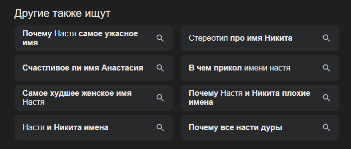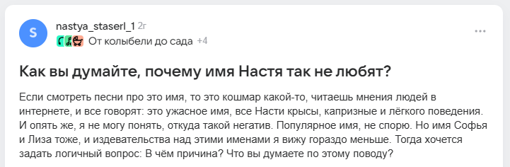 >>6140813 >>6140852 Да это всё конечно чисто человеческая нелогичная хуйня. Баг мышления, вызванный тем, что у нас в ближайшем окружении редко есть много людей с одинаковым именем. А почему именно Настя - это имя было самым популярным в РФ у девочек, рождённых в первой половине нулевых, причём с огромным отрывом. У меня сестра 2001 года, у неё в детском саду в группе из 20 человек было 5 Насть, вжушк. Хорошо помню, потому что на протяжении нескольких лет забирал её оттуда после своих уроков и знал всю её группу. А сейчас все эти Насти выросли, и что они, что те, кто с ними общаются, составляют наиболее активную часть интернетов, потому что молодёжь.