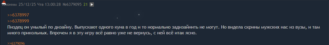 И каждый ёбаный раз, когда я читаю очередного шизоида, у которого было как то по другому, у которого какие то другие люди в треде сидели, я поражаюсь упорству, с которым вы пытаетесь убедить тред, что мы, то кумеры, то щелкунчики, то ещё какая хуита на новозумерском сленге, какие то лишние в игре и в треде, не смотря на то, что пришли на релизе, и с самого ёбаного начала радовались что мы ЦЕЛЕВАЯ АУДИТОРИЯ. И прошу заметить, мы как ЦЕЛЕВАЯ АУДИТОРИЯ, всем довольны, до сих пор, а рвётся всякое чудо, всякий скам и биомусор жирушно-соевый, которому горит с этого факта!