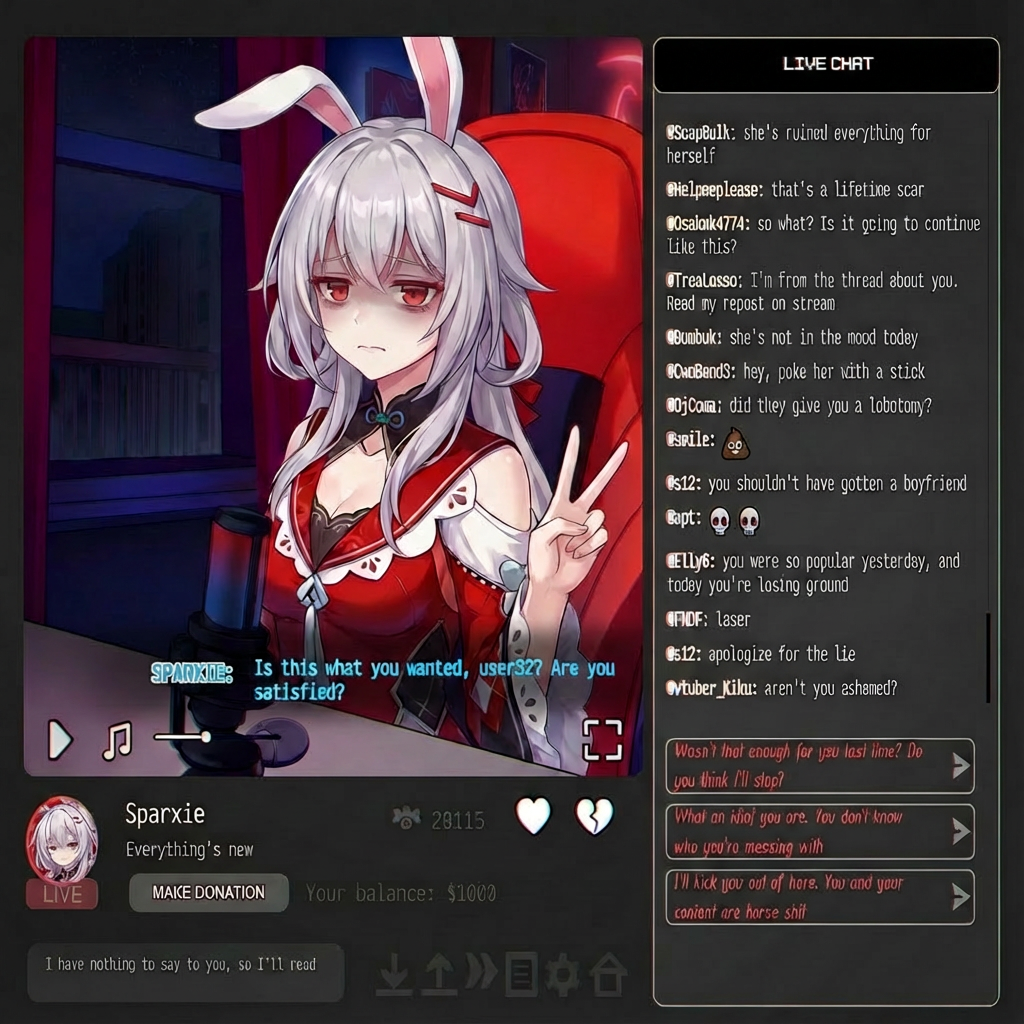 Внимательно всмотрись в это уебище, оно не заслуживает жизни, оно не заслуживает счастья. Оно должно страдать, к этому чуду не может быть никакого сострадания. Сука, это впервые, когда я к вымышленному персонажу испытываю такую агрессию. Для меня, навязанная, дутая любовь к ней не работает просто потому, что она - это презренное, ебаное животное. Надеюсь, что в каком нибудь Новом году она наконец умрет обоссавшись и обосравшись.