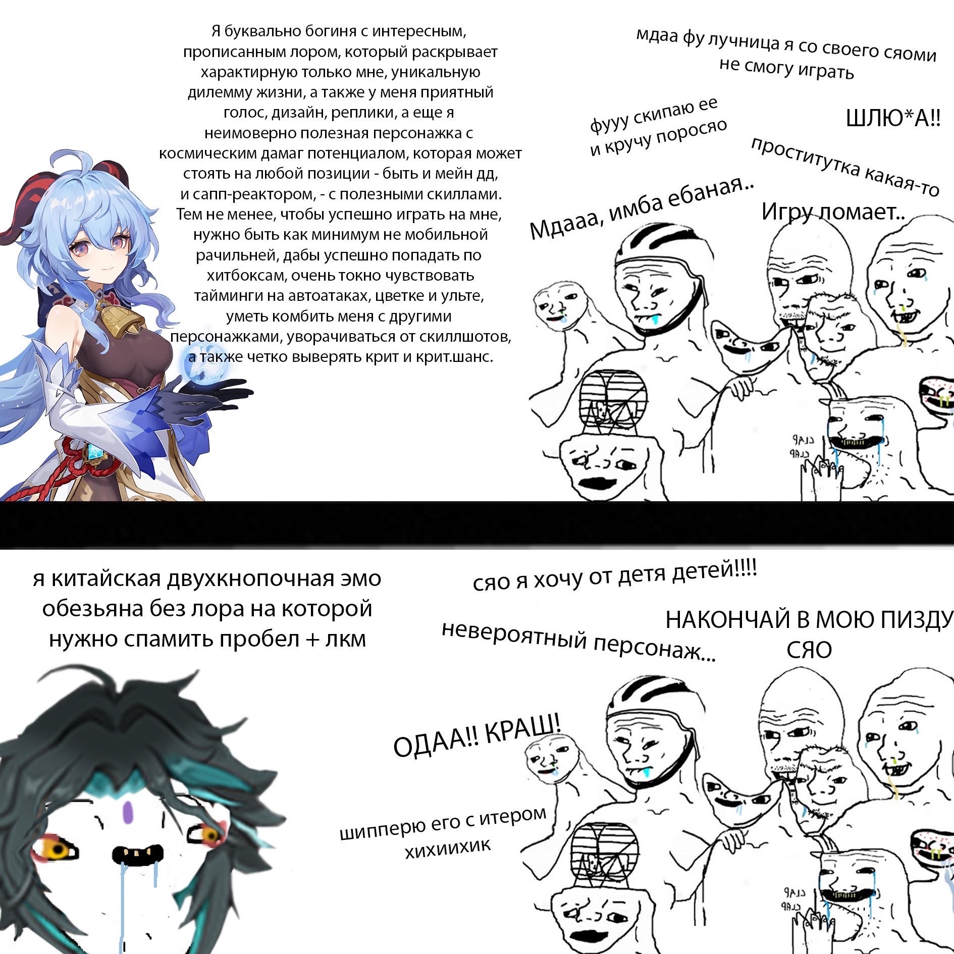 >Да что там с ней не так? Замах был на грозную суровую ебаку, что-то типа Райдэн до конца сюжетки Инадзумы, выхлоп на Коломбину с фестиваля, милую дурашку-очаровашку. Плюс дебильнейший троп девочки-инвалидки-пожалейки. Плюс она слизана с девушки главного сценариста той арки ХСР (буквально сцена в игре скопирована с их личной свиданки на крыше небоскреба с поцеловашками, они выкладывали фотку).