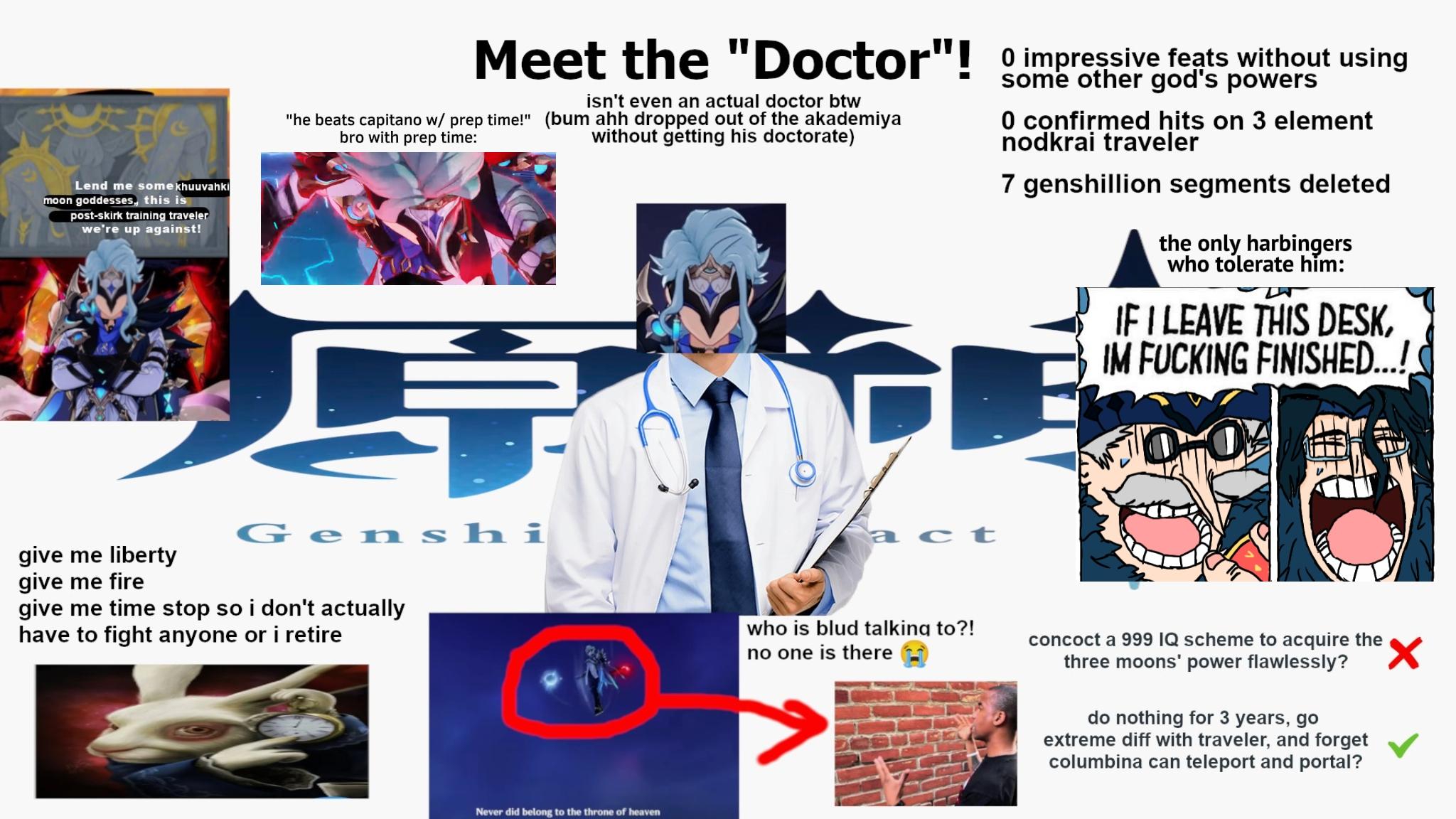 Доктор-бегунок, наводил суету в сумерском ПТУ, принёс в инадзумский дом делюжен и сбил с толку пацана в шляпе, сбежал из Заполярного рабочего дома, стипнул кассу, треко и сегореты, угнал казённую луну, пыхнул с заявки Царицы на строительство нового порядка. При встрече наказать хуем дракона шишкатого.