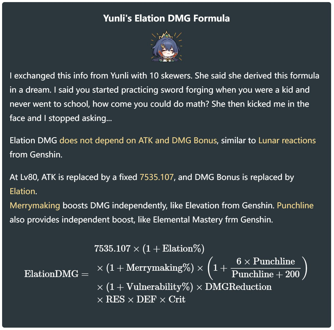 Елейшен дэмэж не учитывает атаку, но учитывает криты, волыну, дефшред и резпен. Чем больше чаров Радости в пачке, тем больше разгоняется этот параметр и сам по себе за счёт механики панчлайнов. Крч, кокблочная срака суть которой дамажить через общего "саммона", накачивая его жиром. Но всё может оказаться ещё кокблочнее, учитывая, что пока что непонятно, как в это всё втиснутся скорбящие актёры, если Яэ окажется одной из них.