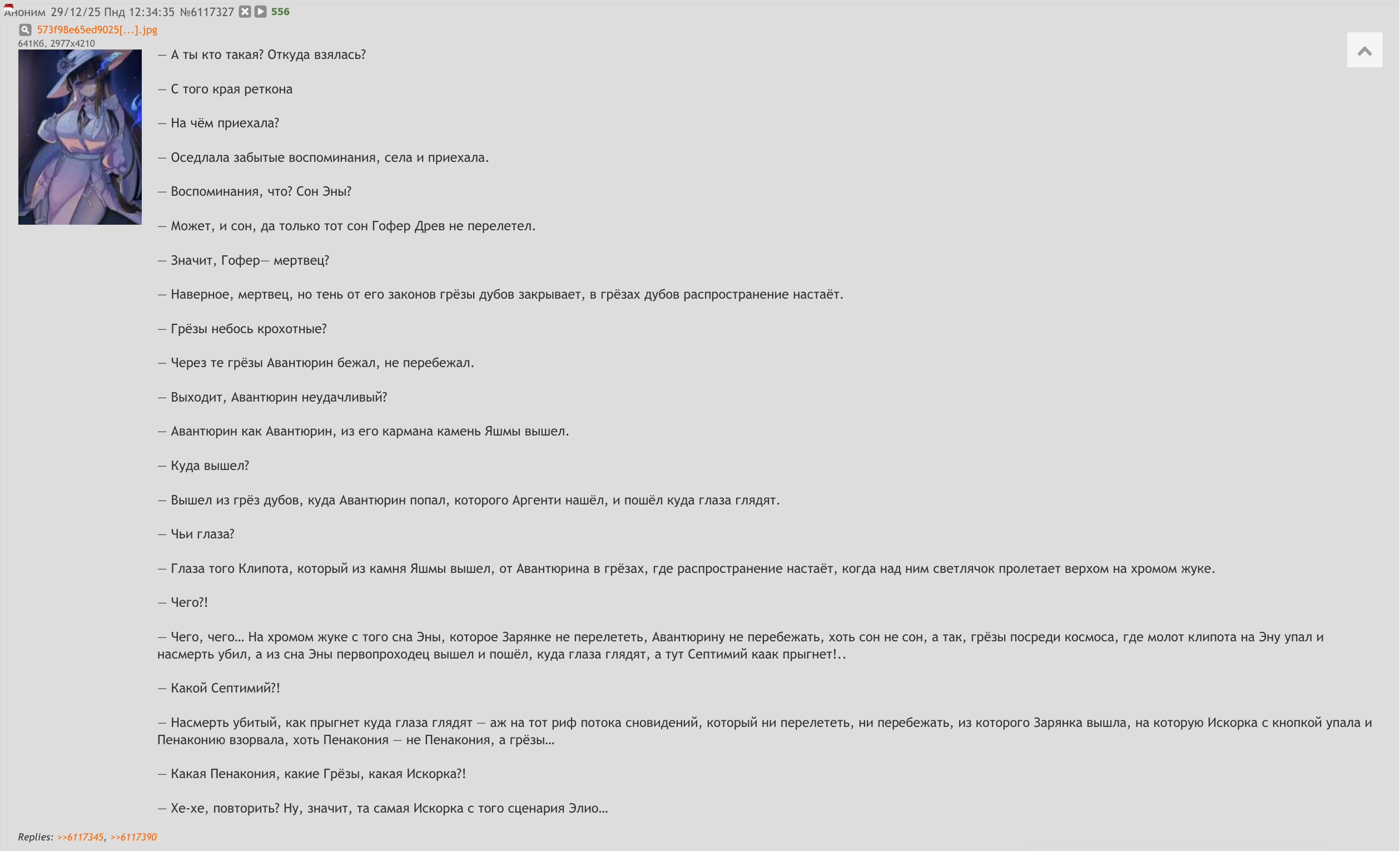 >>6170244 >Верил в телепортирующегося бомжа с квантовой косой Ну да, верил. Потому что это простая концепция и неизменная. Потому что так работает этот мир, что в нем могут существовать телепортирующиеся бомжихи с косами. Вот если бы Белобог писал Шаоджи, то в конце второго из двадцати акта оказалось бы, что Зеле не настоящая, настоящая умерла в приюте, а то что мы видели это неосознанная проекция Брони в этот мир, но мир тоже не настоящий, а наше сознание при подлете загрузило в того робота архитекторов, который симулирует этот промежуток времени 34,56 *10^12 раз, чтоб вычислить как построить стену. Но сама симуляция это на самом деле не симуляция, а сон Зеле из альтернативного таймлайна, где в приюте сдохла Броня. Но это не просто сон, а хитрый план Коколии, которая на самом деле не Коколия, а ебанувшийся осколок эона сохранения. Но на самом деле не сохрания, а энигматы...