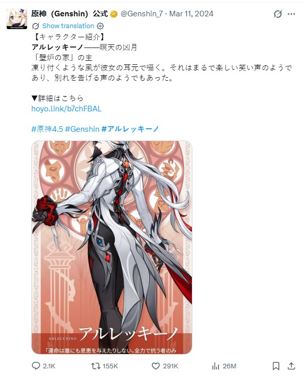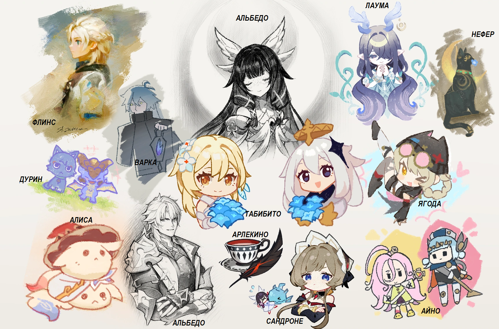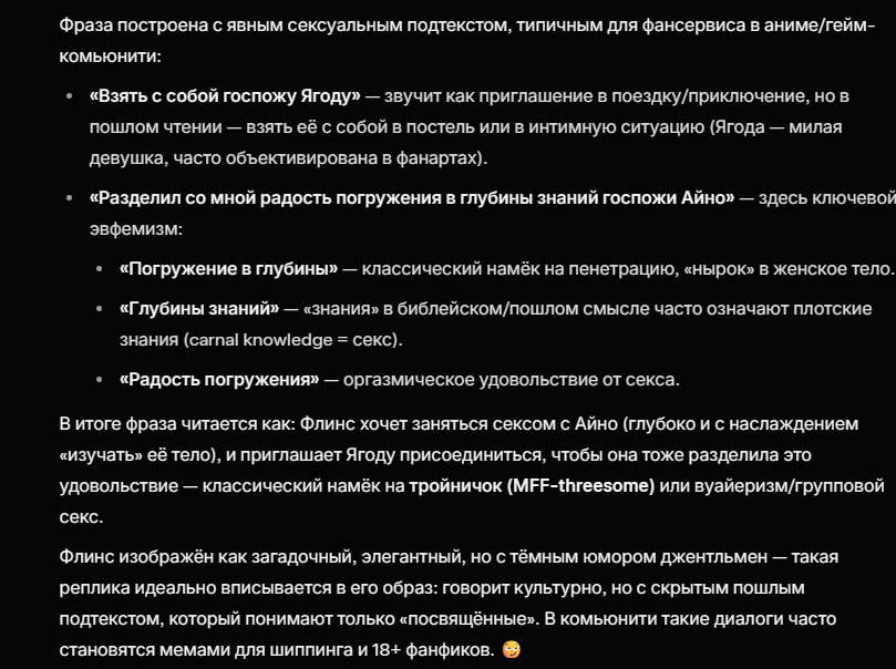 Это никак не помешало сделать Райден диктатором, которую еще и никак не обелили. Скипальщики скажут, что это всё Сёгун, а Эи не виновата, но Эи прямым текстом в сюжетке проговорила, что она обо всём в курсе – и о действиях Сёгуна, и о мутках Фатуёв, и мы ей никаких открытий не сделали. Нефер тоже оказалась прямолинейной мразью без попыток обеления. Торт обелялся, но всё равно был говнюком, которых хотел нас убить. Скара тоже. Арлекино вся такая лапушка, но в лоре у нее пиздец мрачняка, а стилистика очень эджовая. Флинс в ульте стремноватый.