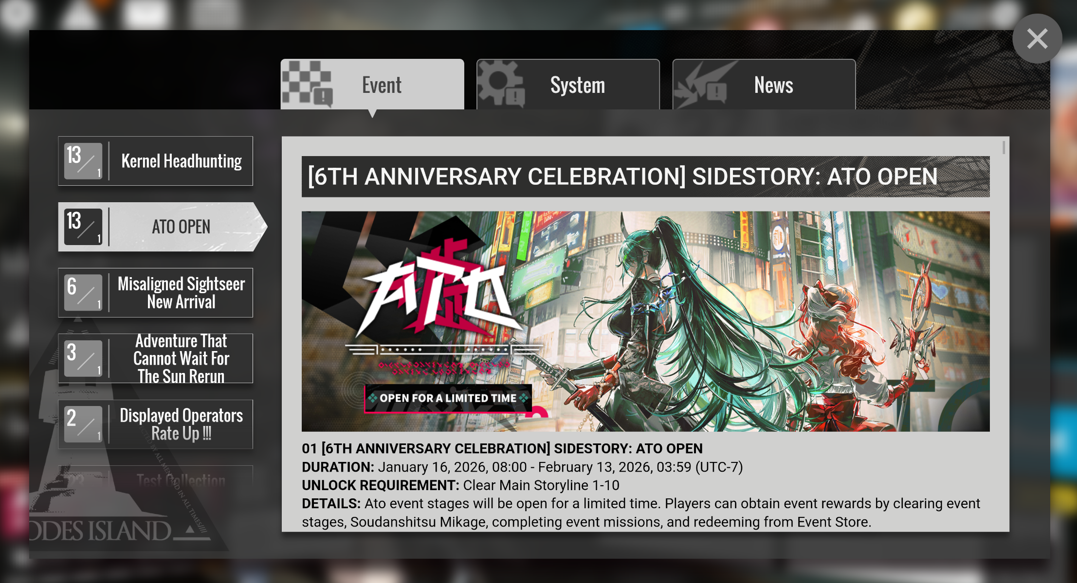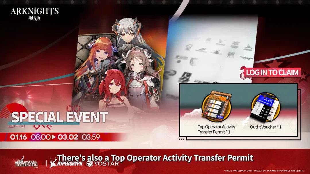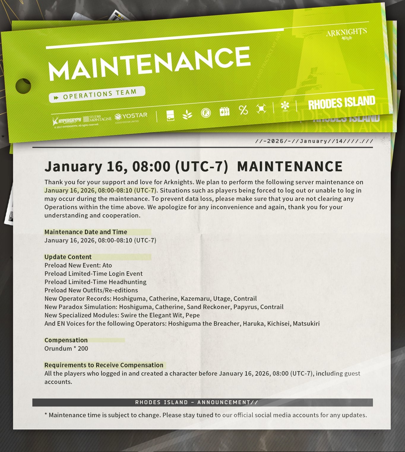 Начался реран прошлого годовщинного ивента Adventure Tht Cannot Wait for the Sun, продлится до 16 января. В его честь завезли новый скин на оперативника Sand Reconer и старые скины. Те, кто не прошел ивент в прошлом году, могут получить бесплатного 5★ медика Papyrus.