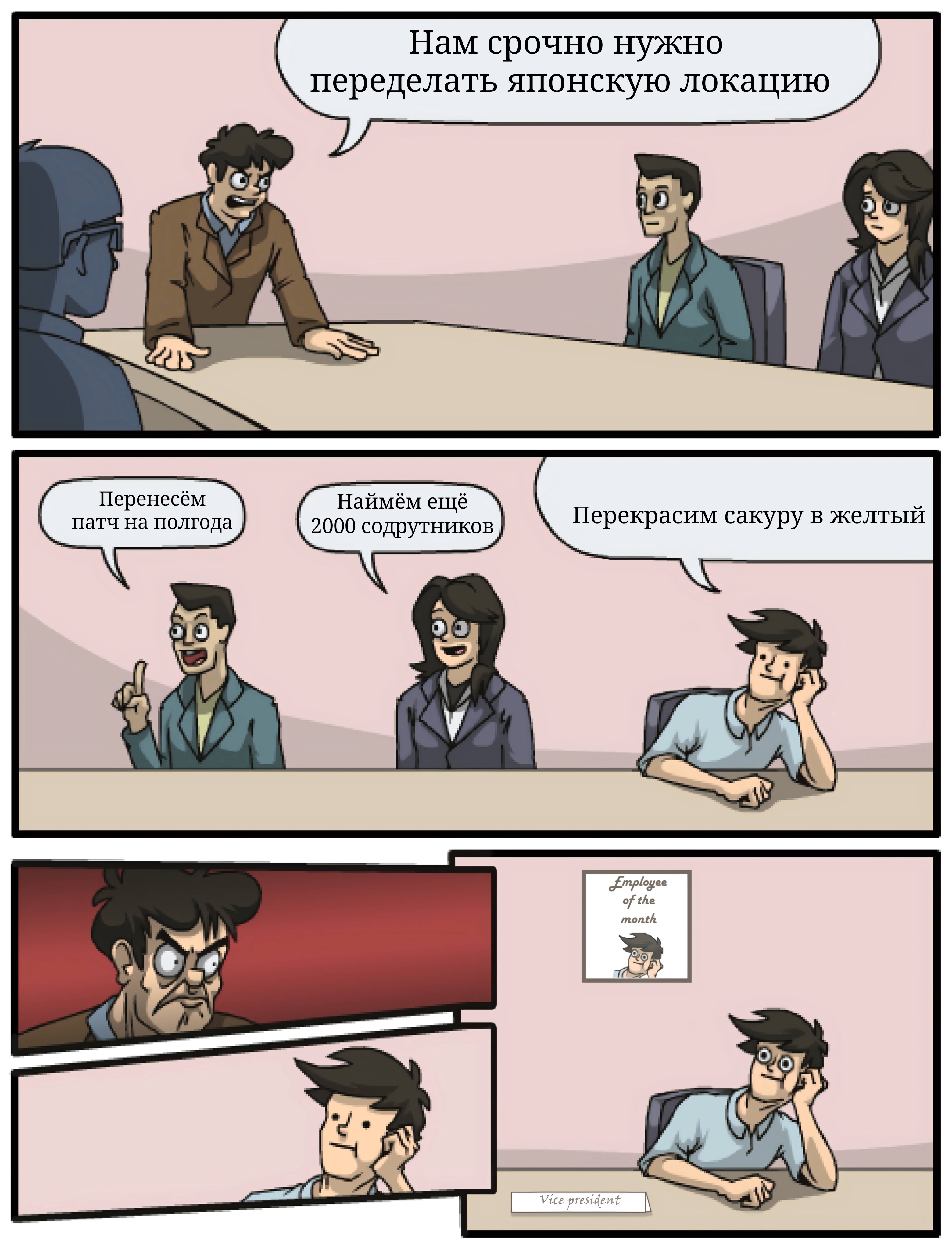 >>6190406 - ВРАГИ НА ПОДХОДЕ СРОЧНО ОТМЕНЯЕМ ВСЕ НАРАБОТКИ ЯПОНСКОЙ ПЛАНЕТЫ - Господин Давей, мы маленькая черноэкранная инди, мы физически не можем за 2 месяца создать даже первую локацию... - И как тогда быть? На меня косо смотрят на партийном собрании. А отмена контента окончательно убьет единственный денежный проект. - У меня есть гениальное решение!