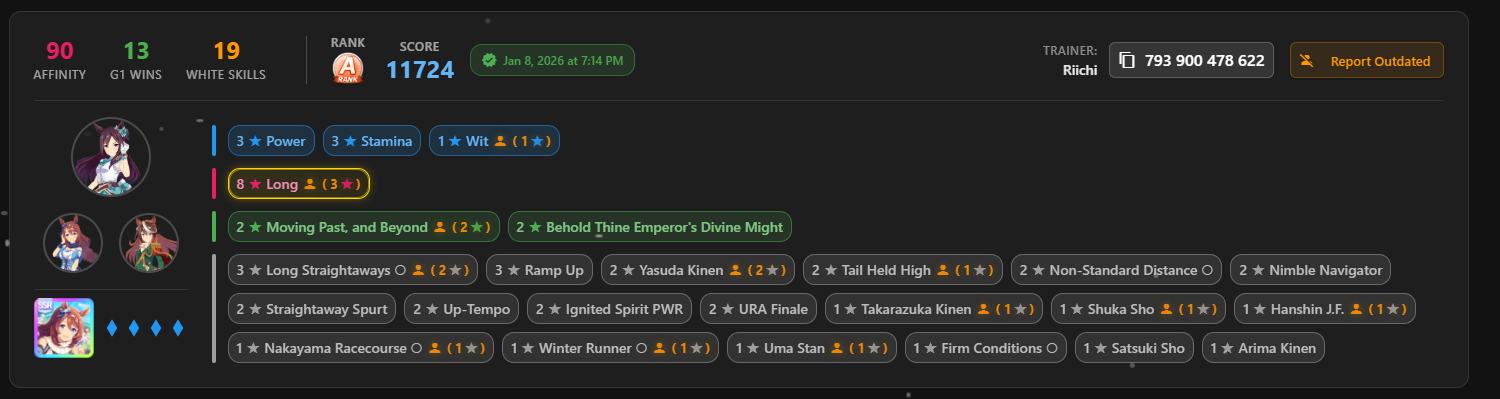>>6187826 Скилл Сейюки мне как-то всегда падал на рандоме от бабушек, но не в этот раз. Ну, не все сразу. С витом ситуация сложная, я беру в саппортах либо ФМ, либо Бико, и без Бико я что-то перестал добирать скорости, выходит не больше 1к. Потому и решил брать меньше вита, но четыре рекавери чтоб наверняка. С такой декой думаю никак не накачать и то, и то. Спида к слову всего один поинт в оверкапе сгорел. >>6187869 По скиллам мне долго постигать оптимальные варианты, ориентируюсь на всякие тирлисты и прочее. Straightaway adept добрал чисто на сдачу, был лучший вариант из предложенных.