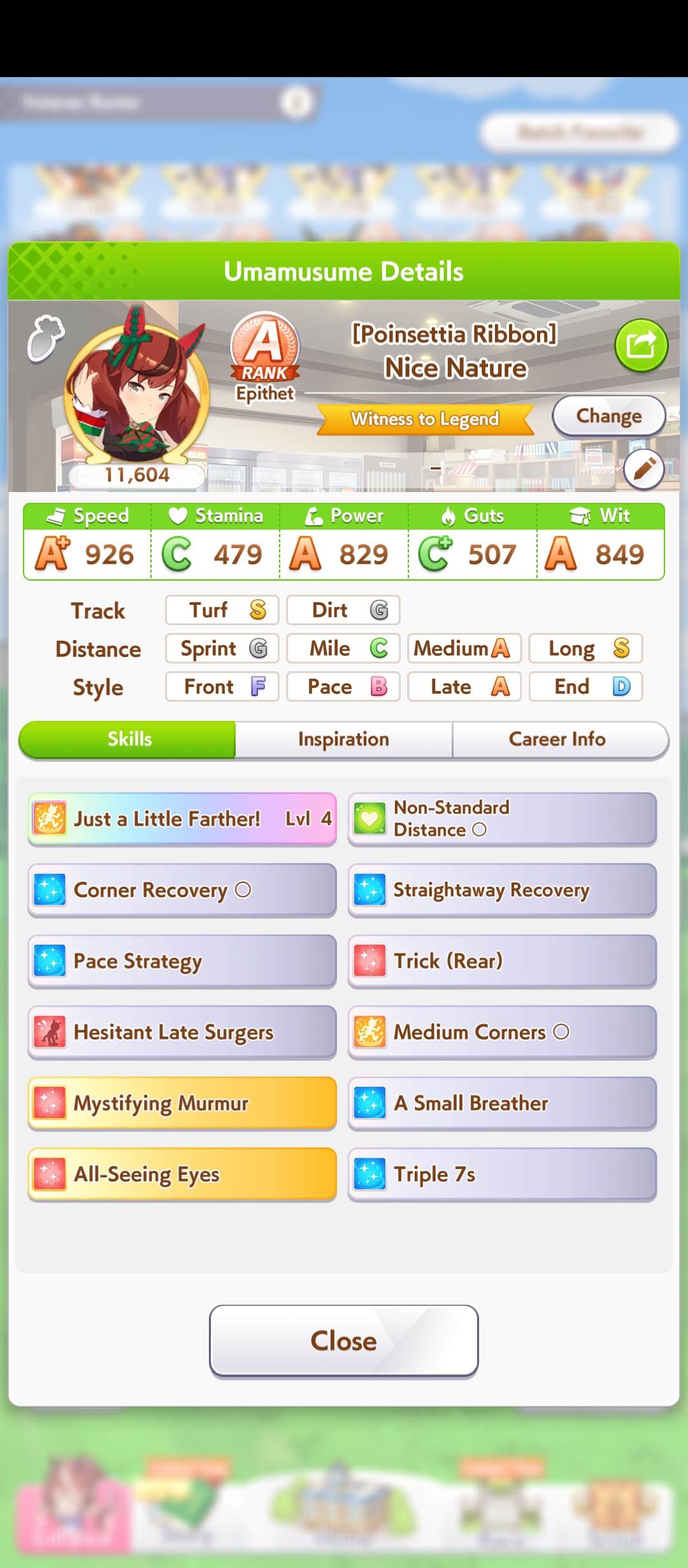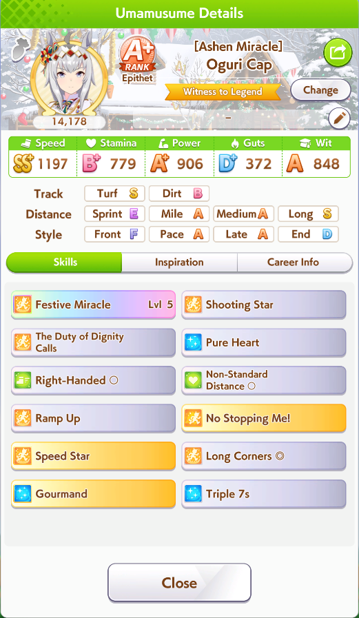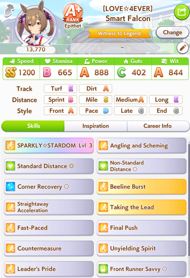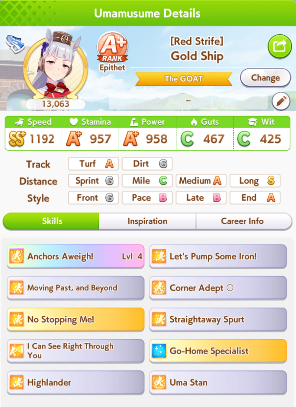 >>6181805 Ну я вот такую пивную сделал с первой попытки. Ничего вроде особо не лузала кроме одной гонки на грунте, куда я её с Б-шкой отправил, думал статами задавит, не задавила. Статов действительно по меньше набирает, но в целом не такая уж проблема, перекрывается по ходу карьеры скилами на гонки. Тут надо учитывать что она фактически всю карьеру без ульты бегает поэтому и лузает, просто надо поправку на это делать. Поэтому любителям бегать по китовому на одних статах она и не очень подходит, а вот пиву вроде меня в самый раз. Это при том что что лузнула три трени за карьеру и самое обидное спид на +57 с 23% вероятностью провала еще и с dont overdo, пиздец короче, а так бы может еще и неплохая вышла. Я всё-равно не знаю как в этой игре спид качать нормально, даже с тремя спид картами выше 1к обычно не набирается на любой уме.
