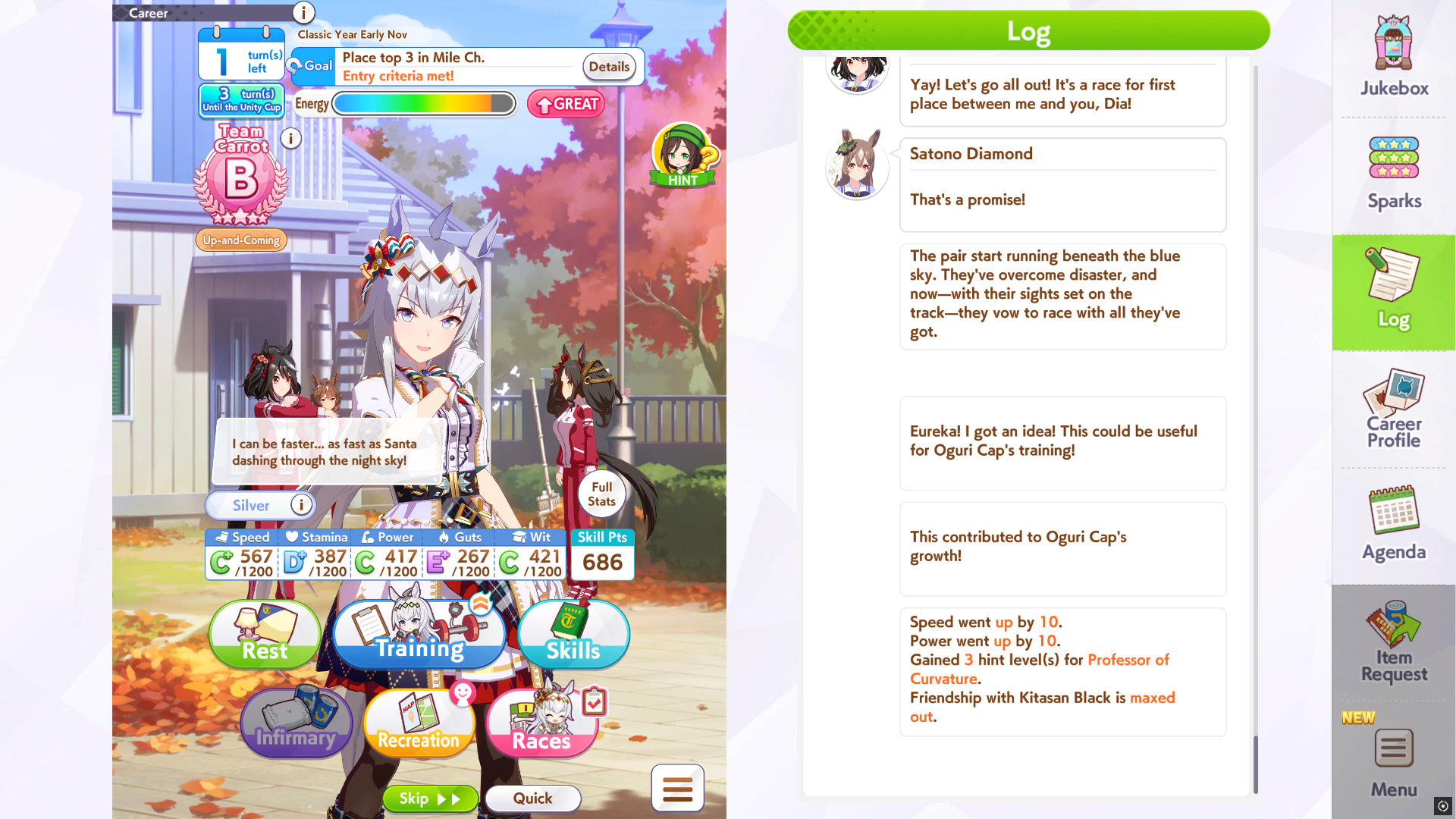 Первый год ты набираешь их дружбу, потом начинаешь ловить радужки. Всегда держи как можно больше энергии чтоб прожать радужку на скорость. Все эвенты на восстановление энергии твои друзья, все эвенты жрущие энергию твои враги. Если на скорость никто не пришел, перед тем, как жмякать на стамину-павер-гатс трижды подумай, хватит ли тебе завтра энергии если будет радужка. Безопасно ход радужками на вит, для больщего регена энергии.