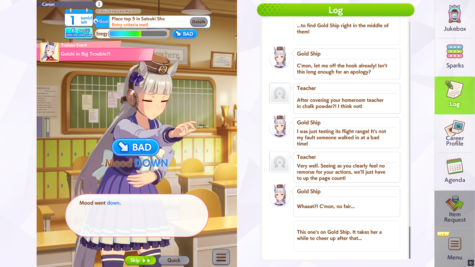 Прошел карьеру пикрелейтед. У нее вся драма в сюжете заключается в том, что на третьем году она захотела расписание гонок немного полегче, а потом передумала. Самая плоская история из тех, что я пока прочитал.