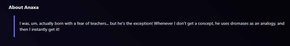 >>6199161 1. Будет перечислять свои заслуги вместо преподавания, если ты что-то не понимаешь, объяснять это всё магией. 2. Максимальная душнина и дрочка. 3. Расскажет байки про геозавров, рассказывая теорию используя их в качестве примера, задокументировано внутри игры, что даже Март начинает понимать о чём речь. Поощряет споры с его точкой зрения. 4. Заткнут через "Послушай" и просто проведёт сухую лекцию.