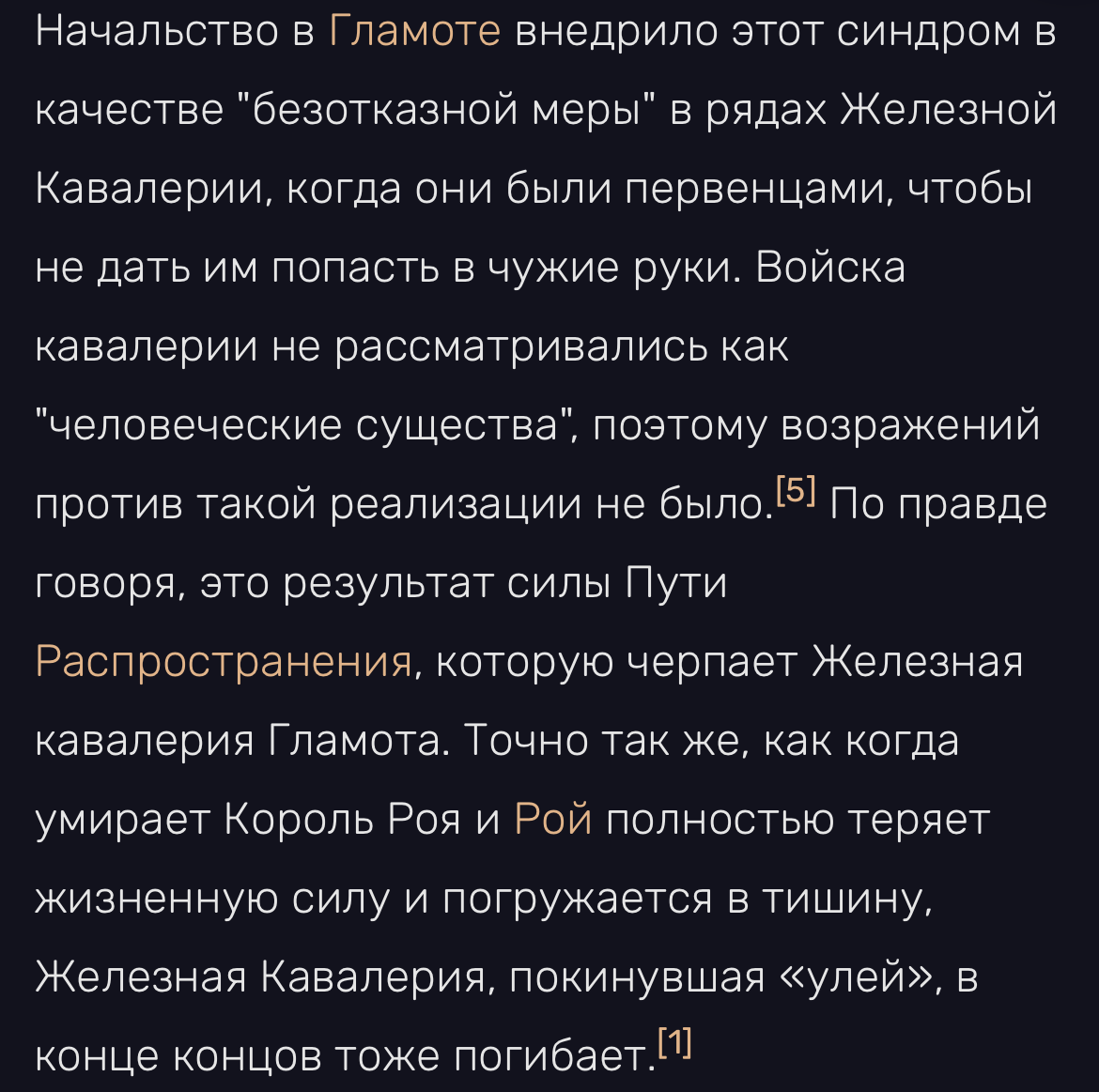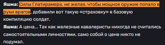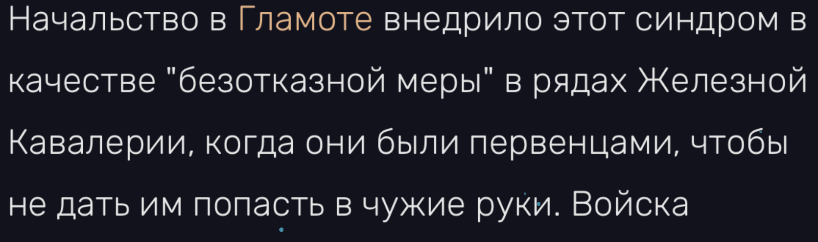 Собственно и вот. Строчка про синдром. "По правде говоря". Это то, что ввели в 3.8, отменив слова Яшмы из 2.3 про внедрение контрмеры против попадания кавалеристов в чужие руки.