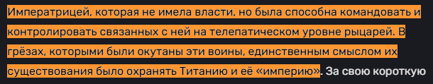 >>6202203 Тебе строчку из лора дали. Причём тут хэдканон? Парируй. мань. > В грёзах, которыми были окутаны эти воины, единственным смыслом их существования было охранять Титанию и её «империю». За свою короткую жизнь они учились, сражались, получали приказы императрицы, бесстрашно противостояли врагу и в итоге погибли с честью.