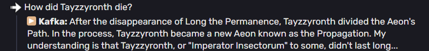>>6202822 Так речь о том, что чтобы заставить путь прекратить существование, нужно поставить его перед неразрешимым выбором, создав парадокс. То есть в случае Постоянства тут выбор между бесконечной жизнью индивида или бесконечным развитием цивилизации, что друг друг как бы противоречит. Ту же Нус Ликург пытался ёбнуть через то, что она как идеальный предсказатель должна сама вычислить как помрет. Так и с Тайзиронтом метод убийства эона скорее всего был через то, что как воплощение истинной жучиности Тайзиронт должен был помереть и дать жизнь чему-то новому. Отсюда осталось "жизнь стремится к смерти" как то, к чему в итоге пришел путь распространения и что его ёбнуло. Вот эту проблему нужно разрешить, дав наконец-то родиться следующему чему-то из пути Распространения. Это и должно решить проблему Светы, которая как рожденная с силами пути Распространения вынуждена пока что разлагаться как и сам Тайзиронт. Для настоящего эманатора как Скаракабаз такое сразу приводит к смерти за секунду. А Светка как бы достаточно не эманатор, чтобы пожить подольше. Но по-настоящему решить её проблему может только откат финала Тайзиронта или рождение нового пути из пути Распространения. Так что Света у нас кандидат на эманаторы нового пути как минимум.