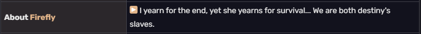 Хз, с чего так некоторые горят со Светлячка. Мне она не особо нравится как персонаж (выбил чисто как боевую единицу), но взаимодействия с ней в игре сделаны нормально, какого-то кринжа не вызывают. Пример как можно сделать плохо - текущая псина-войдхантер в зетке, вот там перс пропихивается максимально топорно и прямо с какой-то ненавистью к игроку, типа жри, вонючий мерзкий инцелишка, ты же этого хотел, уёбок ущербный. Я даже тильтанул с такого и снёс этот кал, несмотря на подписку.