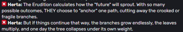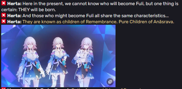 Сюжет игры буквально вертится вокруг предотвращения тру-завершённости, в рамках вечной борьбы за само существование наработанного, дабы не ресатать ничего и не становиться кормом для миров поменьше. При этом пути не могут существовать без рождения Эона, это также в игре прописано чёрным по белому. То, за что же ты цепляешься "Фули может родиться только в конце" - размытое понятие. Дабы не нарушать логику мира и повествования, фраза скорее указывает на его завершённую конечную форму, как сущность осознающую себя. По типу Нанука. Но он вполне может существовать в неполной форме. Пример: призыв руки мёртвого эона Эны. Если бы Фули рождался бы только в конце вселенной, то и сам путь Памяти не существовал бы. Как и не было бы смысла в сцене, где Кирена показана как Фули, продолжая нахуй после этого сюжет дальше как ни в чём не бывало, игнорируя текст тобою же про Нус, которая руководит направлением роста ветвей. И скорее всего тот фрагмент встречи с дединсайд трейлблейзером иного пола являлся пересеченеим ветвей нашего и достигшего завершённости мира. Тут конечно можно уже зацепиться, не может ли Фули существовать как Эон через уничтоженные ветви в рамках всей структуры древа. Но так или иначе, у нас есть конкретная сцена, где сама Кирена показывается на короткий миг эоном Фули, как и прямая фраза, что КАЖДЫЙ ЧДН имеет те же возможности. То, что Март свободно гуляет говорит о том, что она эту стадию уже прошла, что ознаменовало рождение Тьмарт. И это подводит нас уже к неприкрытой связи между Памятью и Энигматой. И как же в рамках твоего псевдофолософствования с Буддой уживается в его тени Мифус?