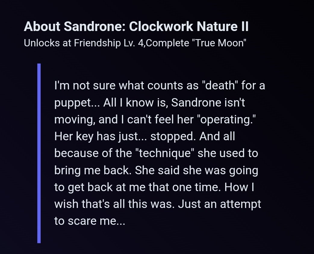 Я не знаю, что считается «смертью» для куклы... Я знаю только, что Сандроне не двигается, и я не чувствую, что она «работает». Её ключ... остановился. И всё из-за «техники», которую она использовала, чтобы вернуть меня к жизни. Она сказала, что однажды отомстит мне. Я бы очень хотела, чтобы всё было именно так, что это была лишь попытка напугать меня...