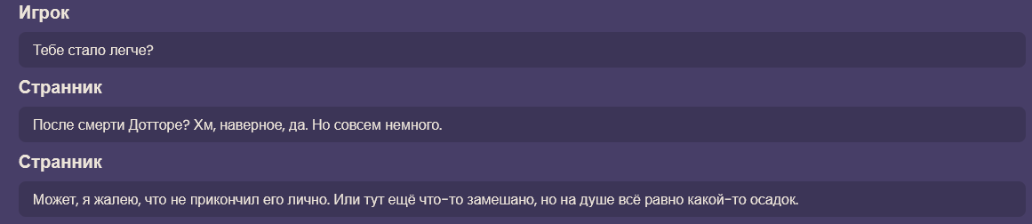 О Докторе: Было время, когда Доктор заботился обо мне. Говорил, что относится ко мне как к родной сестре. Позже я поняла, что чем ближе человек к нему, тем легче ему этим человеком манипулировать. «Мы семья, а потому должны быть терпимее друг к другу, разве нет?» Я видела, что он искренне так думал, но я не хотела «терпеть». Эти ожидания напоминали мне о жадных взглядах возле алтаря в моём первом доме.