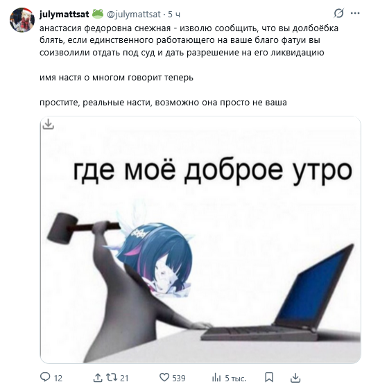 >тут уже дядя грань перешёл Чел настолько обезумел от потери тяночки что прямо там сам хотел так же раствориться, но не смог потому что он из Снежной и поехал кукухой окончательно.
