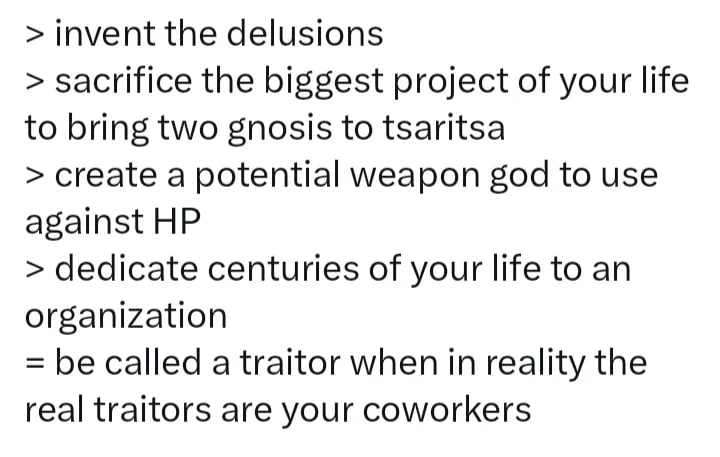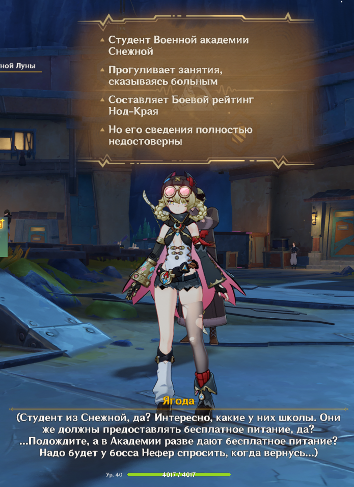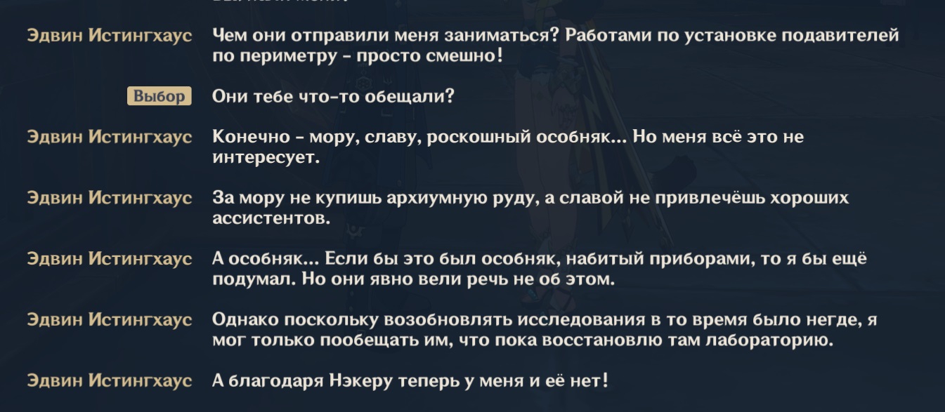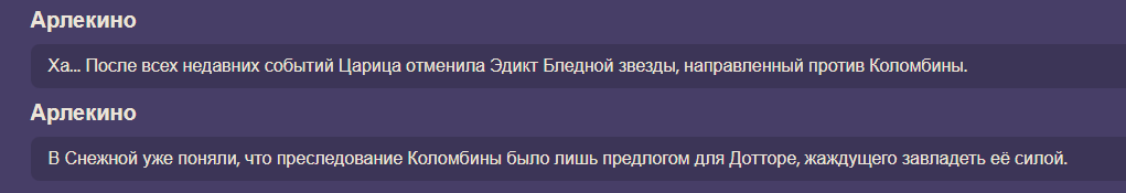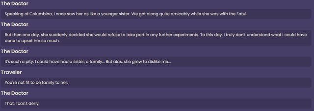 Чё они с Докторм сделали, я вообще не понял, если честно. Вся инфа в игре о нём и так специально подавалась в формате интерпретации, без конкретики, но при этом все вокруг продолжали говорить, что он мудак, даже если речь шла о молодом Зандике, который нихуя не успел сделать, и даже если об этом говорил кот-пиздабол. Я думал, что есть два варианта: либо Ляо что-то готовит и тут замешана судьба, как у Дурина, по которой Доктор обязан был родиться чудовищем и что бы он ни делал, окружающие будут его там воспринимать, и тот же мета нарратив бы передался игроам; либо Ляо просто пишет злого злодея без нюансов, а интерпретацию оставляет из-за лени, а не по задумке. Я был готов к обоим вариантам. И я нихуя не понял, что я в итоге увидел. Потому что чуваку опять накинули кучу полунамёков на мотивы, предысторию, чувства, в конце концов, включая его братскую привязанность к Колумбине, как бы снова намекнув, что он банально ненормальный и не понимает, что такое настоящая семья, но ему всё ещё как минимум жаль, что он не смог быть нормальным. Но в то же время он ведёт себя в смежных же диалогах как злодей с закрученными усами и творит лютую хуйню, а диалоги с ГГ выглядят как диалог антагониста из сейнена с протагом сёнена. В итоге персонаж совершенно непонятный вышел, ни туда, ни сюда. И совсем злым не получился, и в то же время неоднозначным его не назвать, ибо намёки такие жиденькие, что гадай, специально они там или нейронка сбоила. И это главный злодей региона. Сплошное разочарование. Могли бы его ещё в Сумеру ёбнуть и ничего бы не изменилось по итогу.