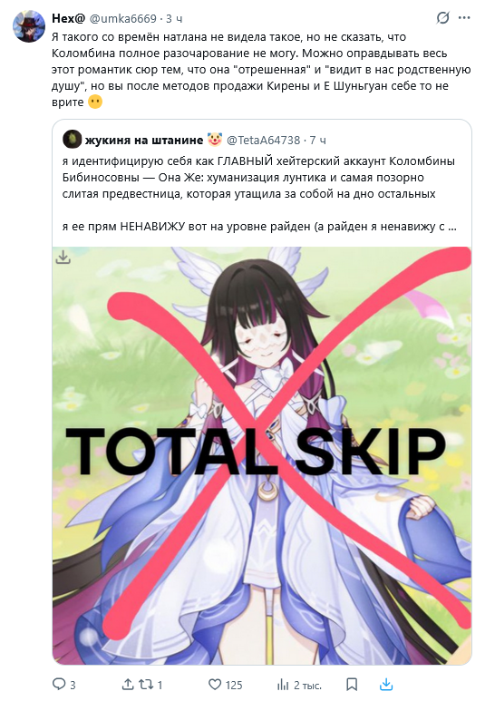 Напоминаю кстати, как нам в Сумеру тизернули, что топ-3 Предвестников по силы сравнимы с богами. И теперь мы проебали весь топ-3 меньше чем за 1 год. И кто-то ещё не верит, что направление игры полностью сменилось на середине Сумеру и пошла волна переписываний в угоду сиюминутному хайпу и новым приоритетам. Ведьм и Грешников как образования а не отдельных нейтральных перчиков как раз тогда начали вводить в лор. Видимо и дали отмашку, что от Фатуи можно избавляться. Но не от девочек, девочек мы крутим, Синьора Инцидент не повторится.