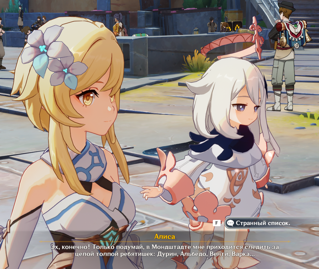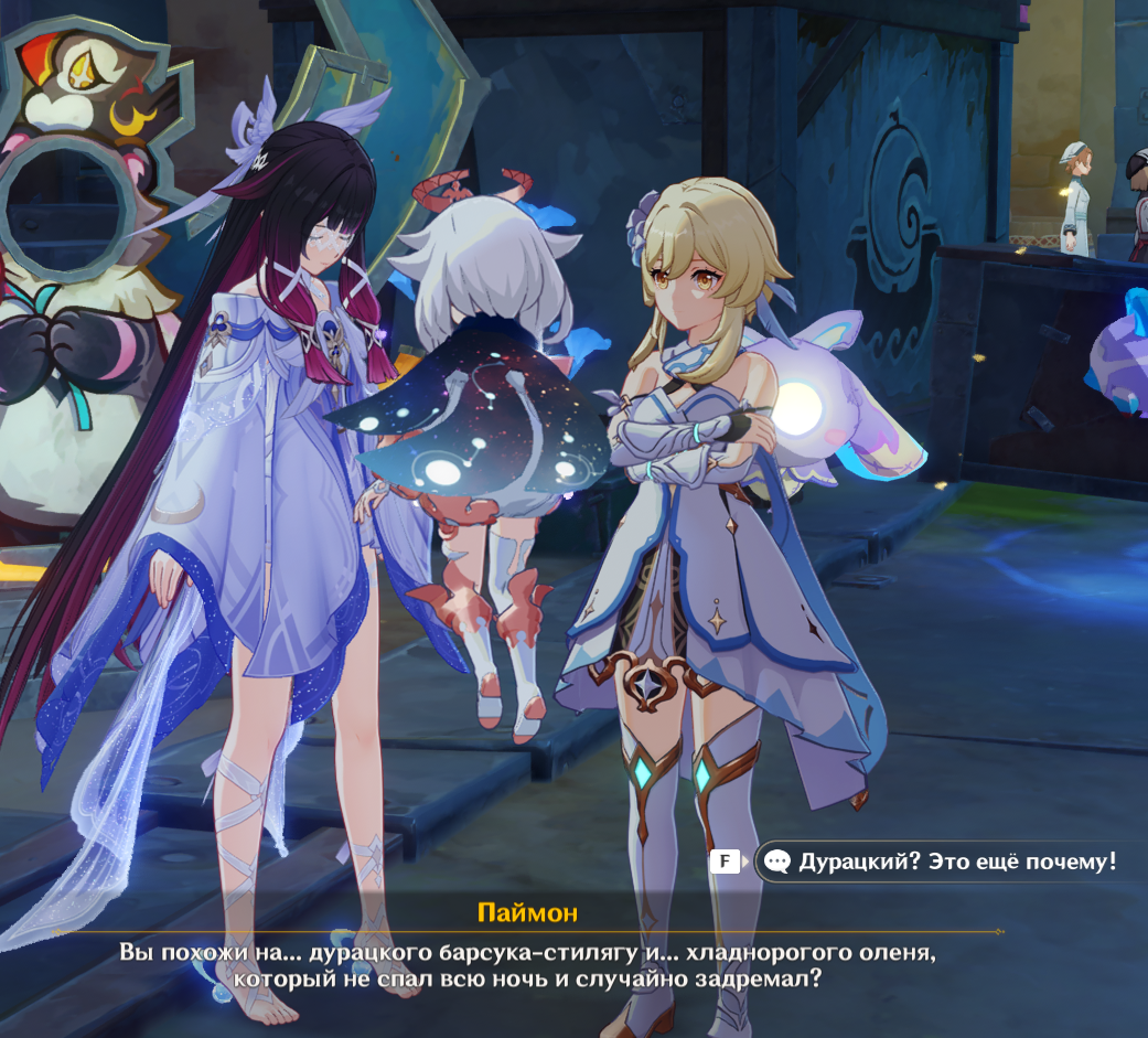 >>6198083 Ого, Люмин, смотри - этот Путешественник очень удачлив! Господин Путешественник, вам очень повезло, наверное также, как нам в Меропиде, когда мы получаем бесплатный богатый обед! А вы голодны? Хотели бы попробовать цыплёнка в медовом соусе? Я бы хотела. А давайте вы угостите Паймон цыплёнком, а я вам за это дам юшку?