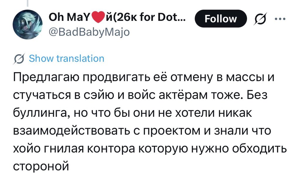 >>6202217 >>6202237 Что-то актёрам озвучки прямо регулярно достаётся на орехи. Как мужик, который Мику (не нашего) озвучивал, ему прилетало потом за слишком хорошо сыгранную роль мерзавца.