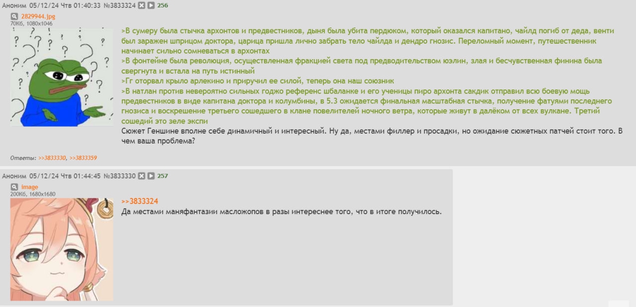 >>6203214 Вспомнил кстати на эту тему те охуенные пасты в треде перед релизом Сумеру, где рандомный анон расписал эпос про противостояние Фатуи и Архонтов, как Доктор сжигает Ирминсуль, смертельно травит Венти и отъезжает от Пиро Архонта, а Торт подыхает об Дыню, но потом все клоны первого собираются в одного меха-Доктора, а Торт возрождается из Пездны и ведёт войска Снежной на Селестию. Ну или как перед Насраном ванговали, как за гнозисом придёт сразу весь топ-3 Предвестников. Эх, лаже те рофлопасты были лучше, чем то, что мы получили. От тредика тогда больше удовольствия получал, чем от самой игры. А на Калтейне мы скатились к бесконечным перебрасыванием говна по типу "терпи, паймон" и проходов в пикми.