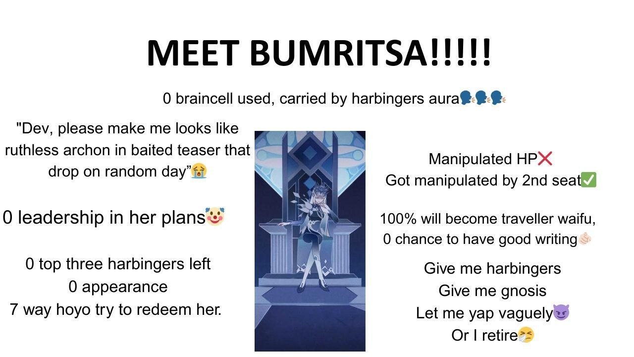 2) "Давей, игрокам не нравится архонт! Они говорят она слишком идеальная и Мери Сью" "Принял, передай сценаристам, что нам нужно сделать архонта следующего региона еще ближе к определению Мери Сью"