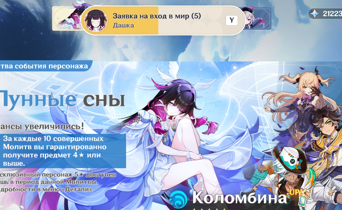 Сейчас расскажу, почему ваша Коломбина – халтурная херня. Автор давно приметил загадочную девушку из тизера Предвестников, напоминавшую библейского ангела, и начал копить аккурат с выходом Нод Края. На безудежно веселое собирание гемов ушло пару месяцев. И вот, наконец, валюта для китайской гачи была добыта потом и кровью. Автор выбивает несколько клумб, сигну. Идет тестить.