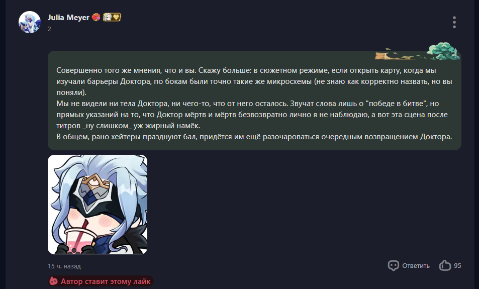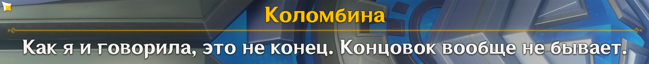 У меня по сюжету всего пара вопросов. Нахуя сделали бессмысленное самопожертвование Сандроне - оно выглядит слишком потужным, можно было и без него легко обойтись. Нахуя Варка отправился в экспедицию. Его заруба с Рери и доктором была ситуативной на месте, в чем причина его прихода в Нод-край вообще? Почему те же тени нихуя не сделали Дотторе? Единственное оправдание - ждали смогут ли смертные сами разобраться с проблемой, как поясняла Ронова в калтане. Что теперь с Колумбиной. У неё теперь автоторити как у четырёх теней/доктора за счёт силы трёх лун. Просто теперь все дальнейшие проблемы она может попячить, только если не вмещается сила извне типа бездны.