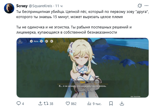>>6215972 Откровенно говоря Дотторе все называют лживым психопатом, но он... практически всегда говорил правду? Да, манипуляций ради, но чего у него не отнять, так это честности. В то время, как все вокруг него лицемерные хуесосы, которые притворяются высокоморальными и допропорядочными. Та же Сандроне, кто-то ещё помнит, что она подчинённому язык отрезала? Ляо вот не помнит. Да и хуй бы с ним, она в самом начале Норд Края, ещё в первых трейлерах, была готова анально карать оленеводов и активно продвигала повестку Фатуи в массы. Именно она ответственна за колонизацию Норд Края и ущемление местных, именно её подчинённые насрали в Насране ботами, когда преследовали Инеффу, именно её подчинённые в начале хамски доебались до Лаумы, Доктор всё это время сидел и терпел в лабе. Но стоило пройти 1/5 квеста, как все резко переобулись и не вспоминают о том, что Сандроне нихуя не добрячок, а Паймон, блять, называет её хорошим человеком. Это буквально как Наруто, который называет Обито крутым парнем (начал войну, в которой сдохло 80к человек). Тут конечно масштаб поменьше, но я реально в ахуе с лицемерия этой летающей пизды. Вы блять безобидного фатуйского жирнича отпиздили, пока тот ягоды мирно собирал, потому что "раз Фатуи - плохой", а тут реально совершающую плохие вещи дамочку резко называете хорошей, потому что она дружит с вашей подружкой. И после этого Доктор ещё лжец, ага. Психопат, да, но на фоне этой череды переобуваний в воздухе он образец честности. Как минимум ему не стыдно признать, что он мудак и совершает кучу сомнительных вещей, а также глубоко ненавидит этот мир. А остальные вечно оправдания выдумывают, что мол нет, на самом деле я хороший, это обстоятельства так сложились.
