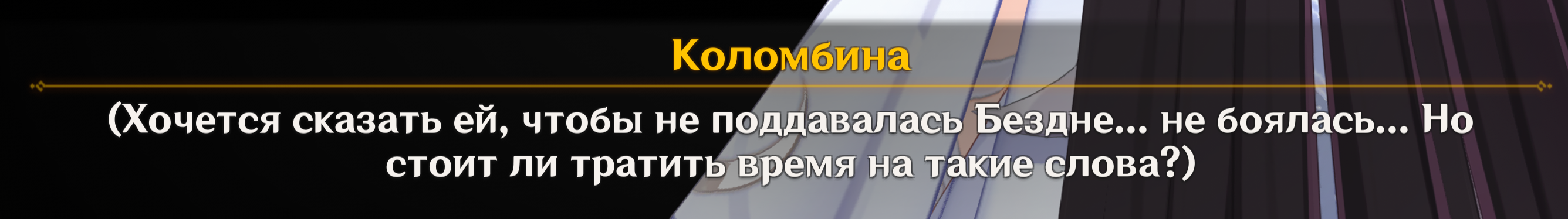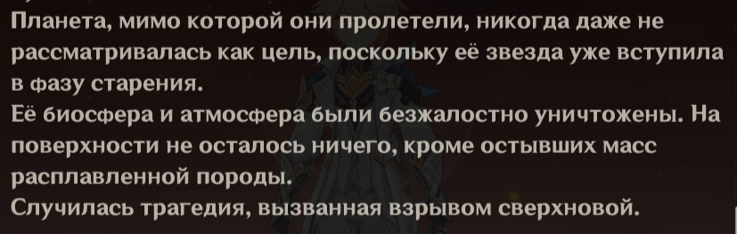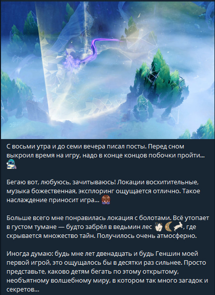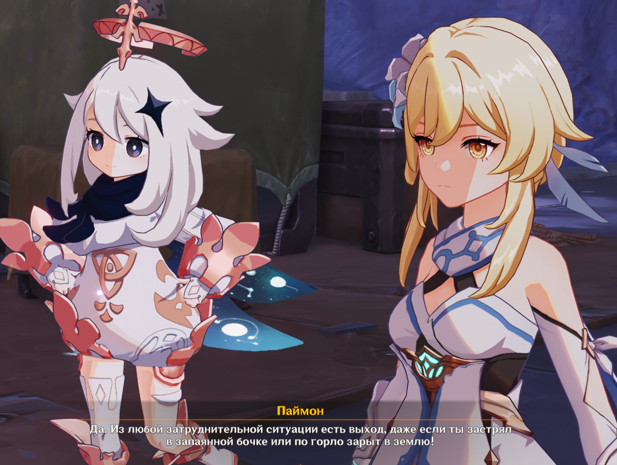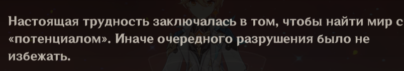 Но если посмотреть на историю, как на книгу... То у ГГ есть характер, есть некоторые принципы, цели, стремления и чувства. ЗЛ, свиданки и сюжетка, по большей части, раскрывают чемпиков. Но вот многие побочки раскрывают именно ГГ. Например в Фонтейне наша Светка - дура дурой, очень наивная: то в клетку зайдёт, то в бочку нырнёт... Но на самом деле, если посмотреть на дальнейшие события и между строк читать, она как бы просто подыгрывает, не чувствуя опасности. Потому что во многих моментах ГГ весьма проницателен, сходу подмечает разные несоответствия и порой даже тцыкает на Паймон, чтобы она не трепалась о том, что пояняли.