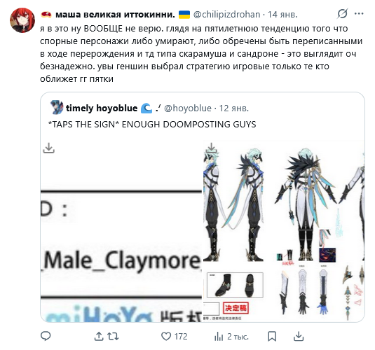 Ебало Фокалорс, которая 500 лет терпела свою многоходовочку и самоубилась, чтобы обмануть небесный порядок, которому оказалось обсалютно поебать на происходящее в Тейвате, вообразили?