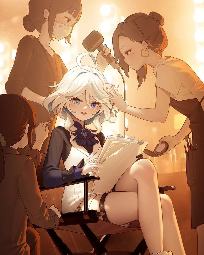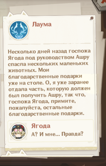 "Она слышала, что у Архонтов в других странах всегда полно дел, и жизнь их весьма нелегка. Одно время она даже пыталась взять этих других божеств за образец и в свободное время пробовала участвовать в реальной работе Дворца Мермония... Но в итоге люди и мелюзины раз за разом тактично отказывались от её помощи, утверждая, что «в настоящее время никаких дел, достойных внимания божества, нет». Фурина была рада это слышать, но после многочисленных отказов поняла - напрасно она надеялась, что работа во Дворце Мермония поможет ей разогнать скуку."